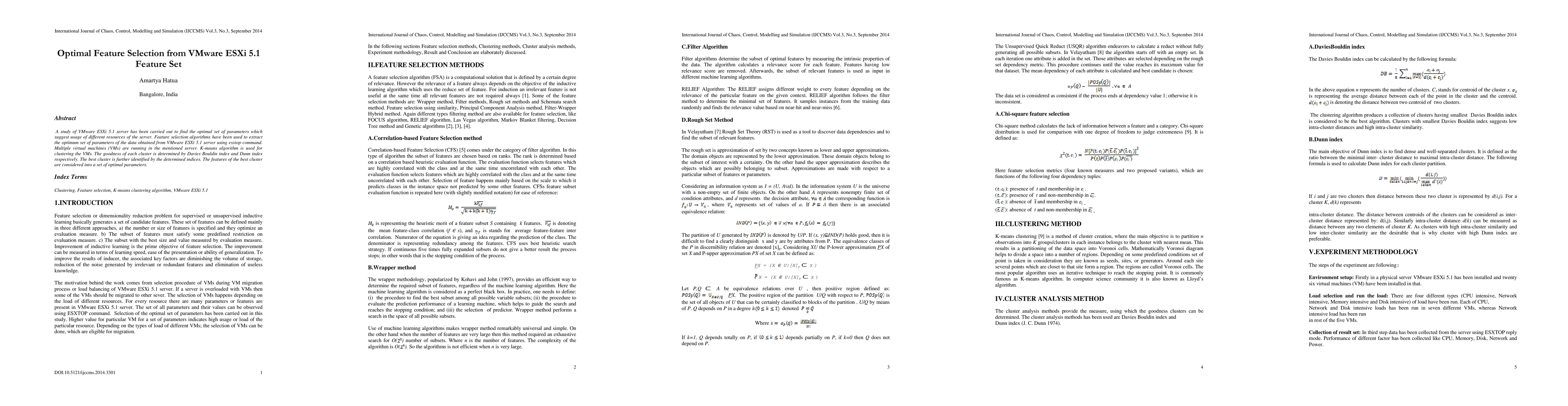 This study uses feature selection algorithms to identify optimal parameters for VMware ESXi 5.1 servers based on resource usage patterns of multiple virtual machines, using clustering methods like K-means.