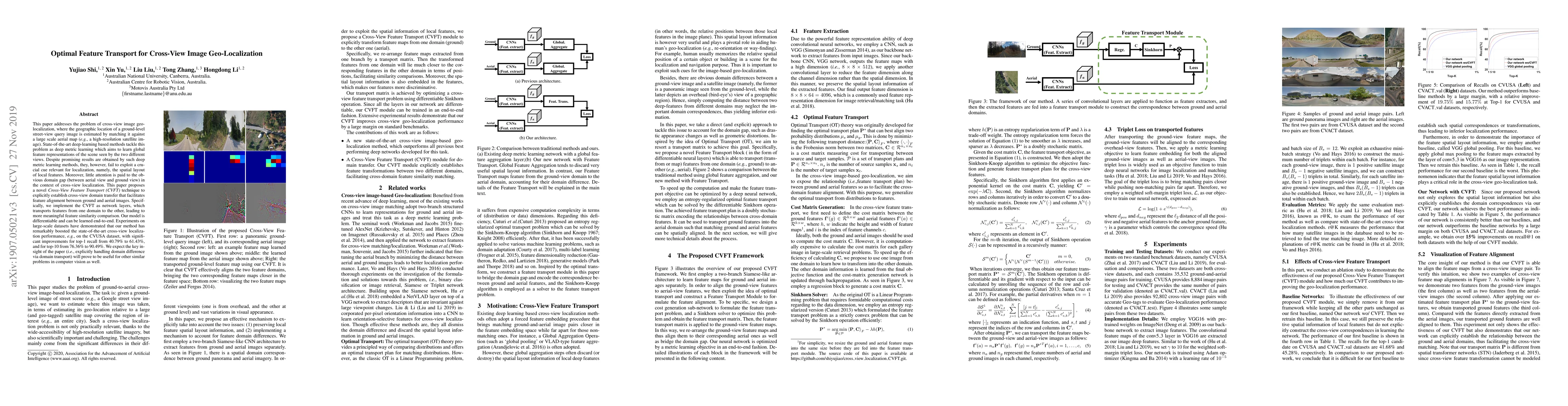 A new approach called Cross-View Feature Transport (CVFT) improves cross-view image geo-localization by explicitly handling domain differences between ground-level street views and aerial maps, leading to significant performance boosts.