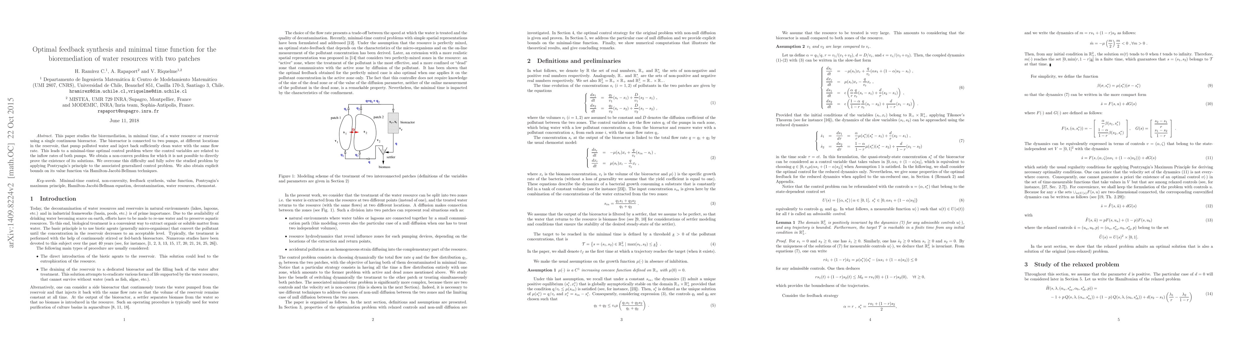 This paper studies the bioremediation, in minimal time, of a water resource or reservoir using a single continuous bioreactor. The bioreactor is connected to two pumps, at different locations in the reservoir, that pump polluted water and inject back sufficiently clean water with the same flow rate. This leads to a minimal-time optimal control problem where the control variables are related to the inflow rates of both pumps. We obtain a non-convex problem for which it is not possible to directly prove the existence of its solutions. We overcome this difficulty and fully solve the studied problem by applying Pontryagin's principle to the associated generalized control problem. We also obtain explicit bounds on its value function via Hamilton-Jacobi-Bellman techniques.