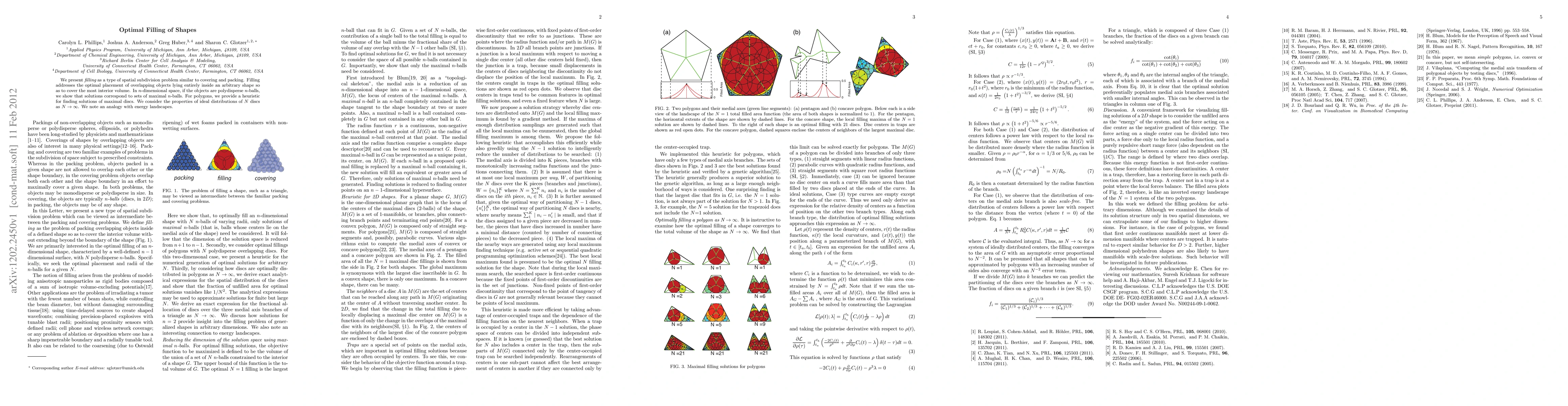 We present filling as a type of spatial subdivision problem similar to covering and packing. Filling addresses the optimal placement of overlapping objects lying entirely inside an arbitrary shape so as to cover the most interior volume. In n-dimensional space, if the objects are polydisperse n-balls, we show that solutions correspond to sets of maximal n-balls. For polygons, we provide a heuristic for finding solutions of maximal discs. We consider the properties of ideal distributions of N discs as N approaches infinity. We note an analogy with energy landscapes.