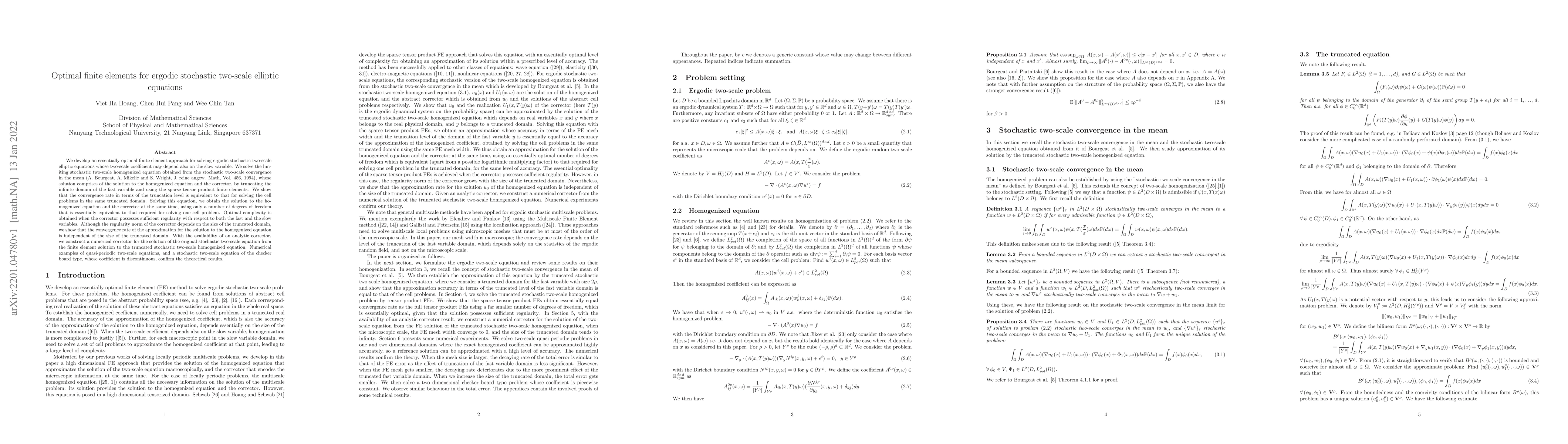 This paper develops an optimal finite element method for solving ergodic stochastic two-scale elliptic equations, achieving convergence rates equivalent to solving cell problems. The method uses sparse tensor product finite elements and demonstrates independent convergence rate from the size of the truncated domain, confirming theoretical results with numerical examples.
