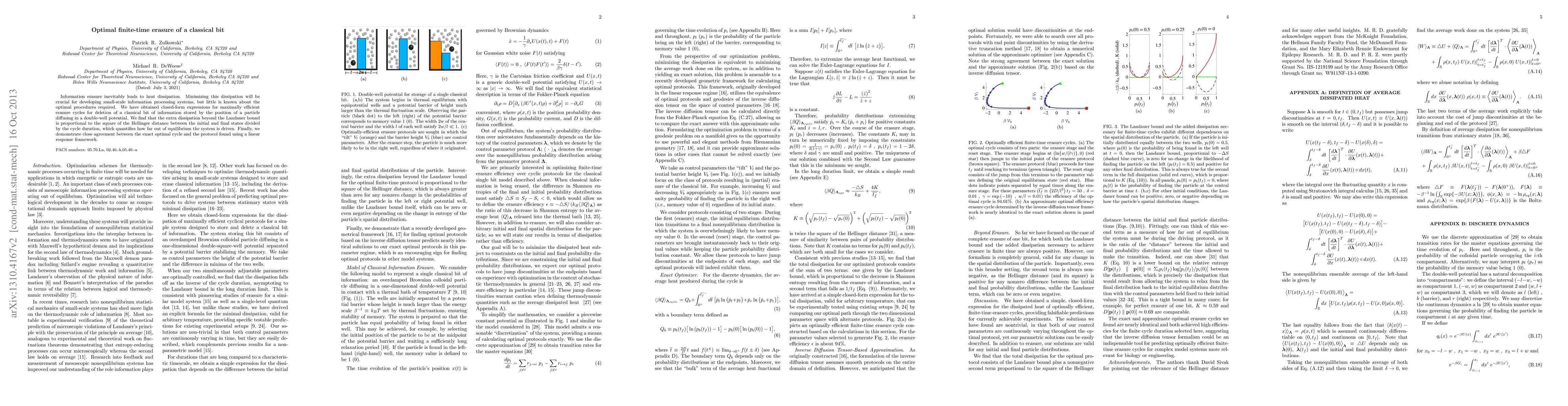 This paper derives optimal procedures for minimizing heat dissipation during the erasure of a classical bit, focusing on the position of a particle in a double-well potential. It finds that extra dissipation beyond the Landauer limit is proportional to the square of the Hellinger distance divided by the cycle duration, and validates the optimal cycle using a linear response framework.