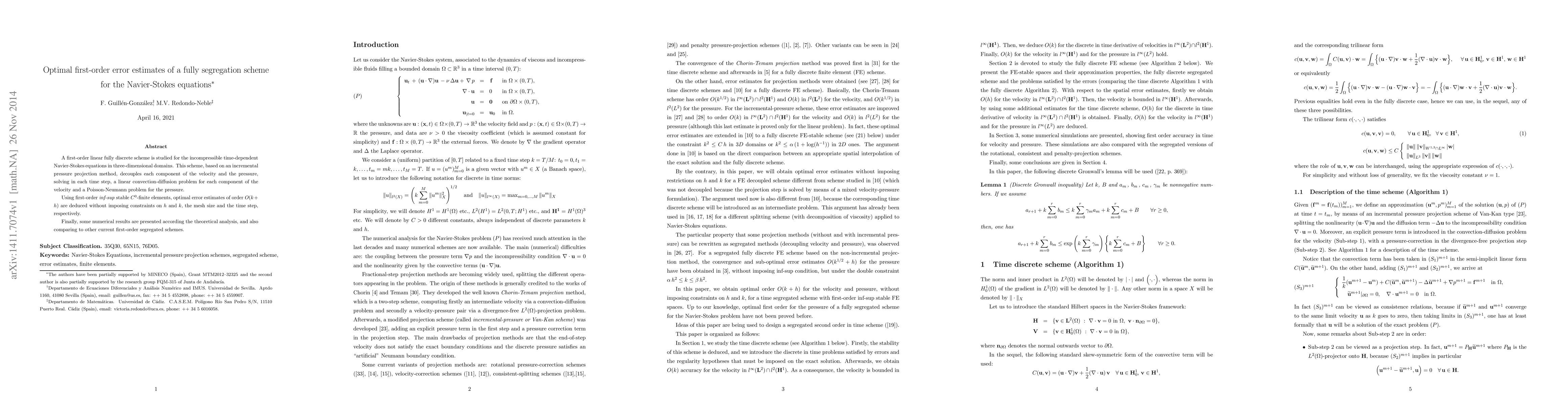A first-order linear fully discrete scheme is studied for the incompressible time-dependent Navier-Stokes equations in three-dimensional domains. This scheme, based on an incremental pressure projection method, decouples each component of the velocity and the pressure, solving in each time step, a linear convection-diffusion problem for each component of the velocity and a Poisson-Neumann problem for the pressure. Using first-order \emph{inf-sup} stable $C^0$-finite elements, optimal error estimates of order $O(k+h)$ are deduced without imposing constraints on $h$ and $k$, the mesh size and the time step, respectively. Finally, some numerical results are presented according the theoretical analysis, and also comparing to other current first-order segregated schemes.