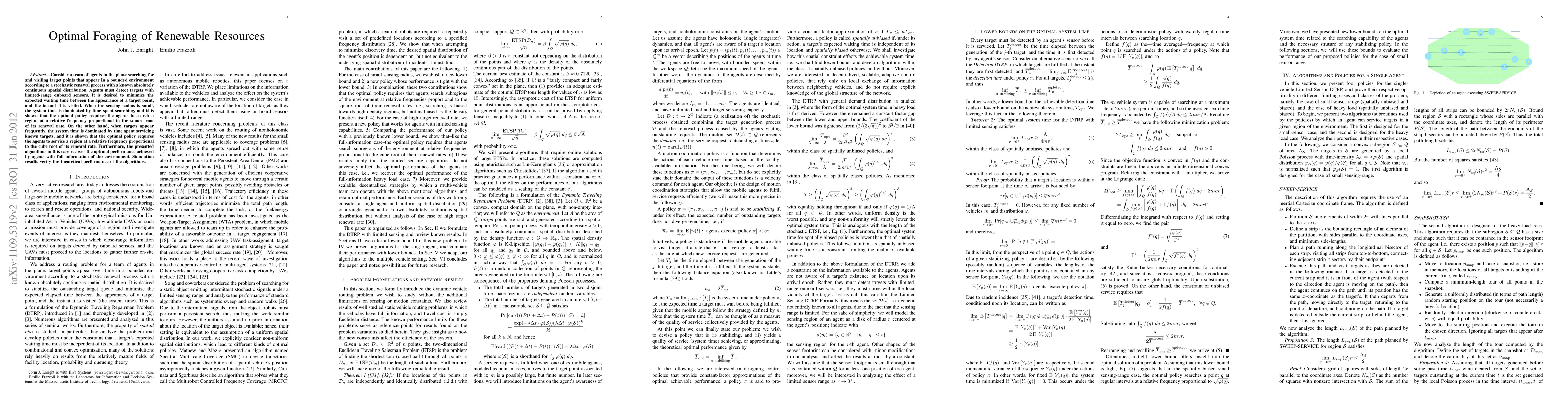 Consider a team of agents in the plane searching for and visiting target points that appear in a bounded environment according to a stochastic renewal process with a known absolutely continuous spatial distribution. Agents must detect targets with limited-range onboard sensors. It is desired to minimize the expected waiting time between the appearance of a target point, and the instant it is visited. When the sensing radius is small, the system time is dominated by time spent searching, and it is shown that the optimal policy requires the agents to search a region at a relative frequency proportional to the square root of its renewal rate. On the other hand, when targets appear frequently, the system time is dominated by time spent servicing known targets, and it is shown that the optimal policy requires the agents to service a region at a relative frequency proportional to the cube root of its renewal rate. Furthermore, the presented algorithms in this case recover the optimal performance achieved by agents with full information of the environment. Simulation results verify the theoretical performance of the algorithms.