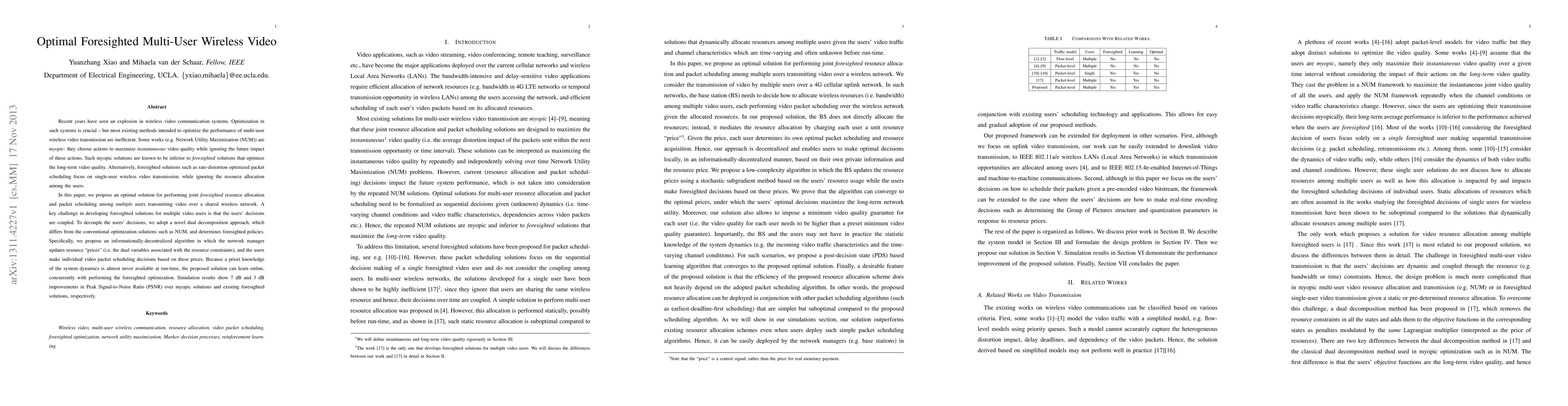 This paper proposes an optimal foresighted solution for multi-user wireless video transmission, addressing the inefficiencies of existing myopic methods. It introduces a novel dual decomposition approach for joint resource allocation and packet scheduling, achieving significant improvements in video quality.