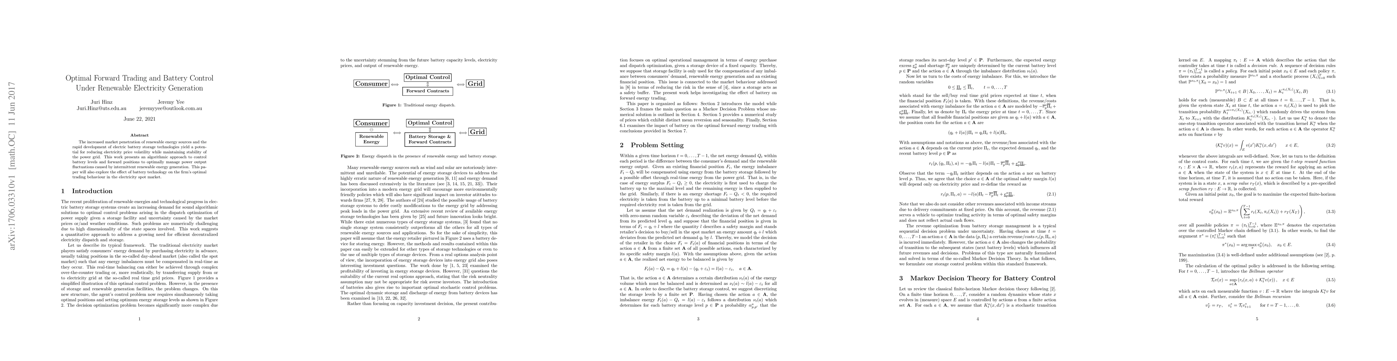 The increased market penetration of renewable energy sources and the rapid development of electric battery storage technologies yield a potential for reducing electricity price volatility while maintaining stability of the power grid. This work presents an algorithmic approach to control battery levels and forward positions to optimally manage power output fluctuations caused by intermittent renewable energy generation. This paper will also explore the effect of battery technology on the firm's optimal trading behaviour in the electricity spot market.