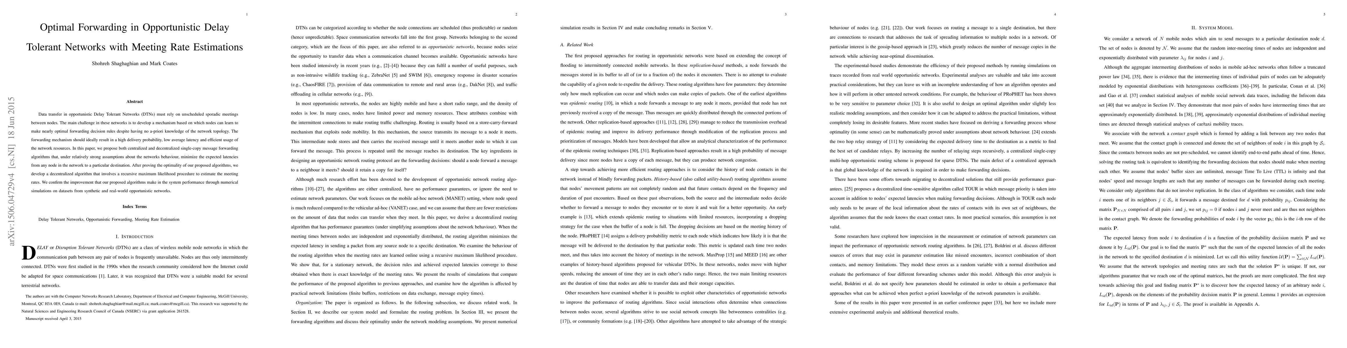 This paper proposes centralized and decentralized algorithms for optimal forwarding in Delay Tolerant Networks (DTNs), aiming to minimize latencies and improve delivery probability. The decentralized algorithm estimates meeting rates recursively, and simulations show enhanced system performance.