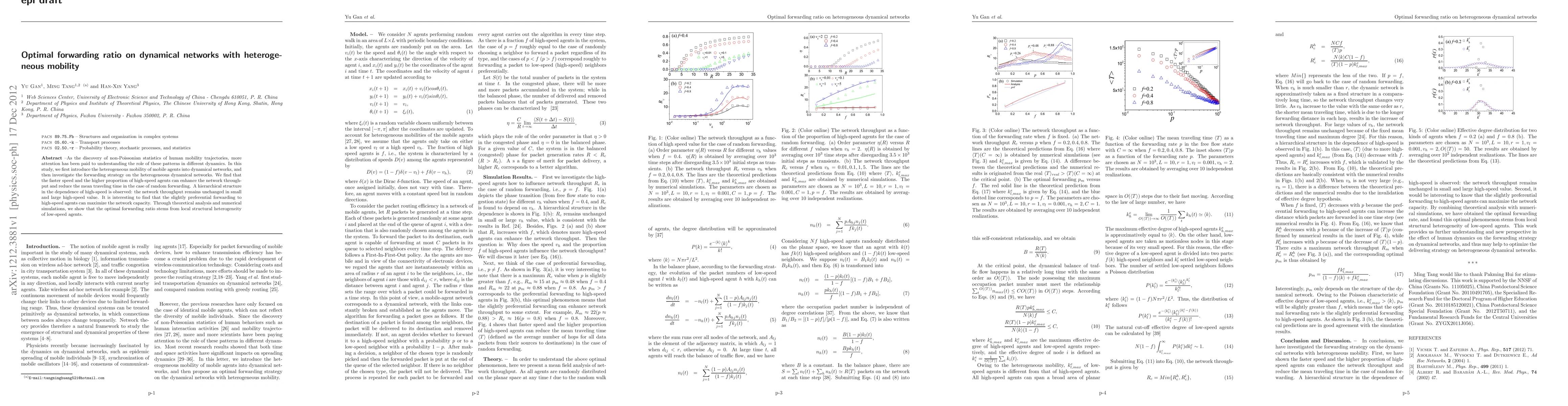As the discovery of non-Poissonian statistics of human mobility trajectories, more attention has been paid to understanding the role of these patterns in different dynamics. In this study, we first introduce the heterogeneous mobility of mobile agents into dynamical networks, and then investigate the forwarding strategy on the heterogeneous dynamical networks. We find that the faster speed and the higher proportion of high-speed agents can enhance the network throughput and reduce the mean traveling time in the case of random forwarding. A hierarchical structure in the dependence of high-speed is observed: the network throughput remains unchanged in small and large high-speed value. It is interesting to find that the slightly preferential forwarding to high-speed agents can maximize the network capacity. Through theoretical analysis and numerical simulations, we show that the optimal forwarding ratio stems from local structural heterogeneity of low-speed agents.