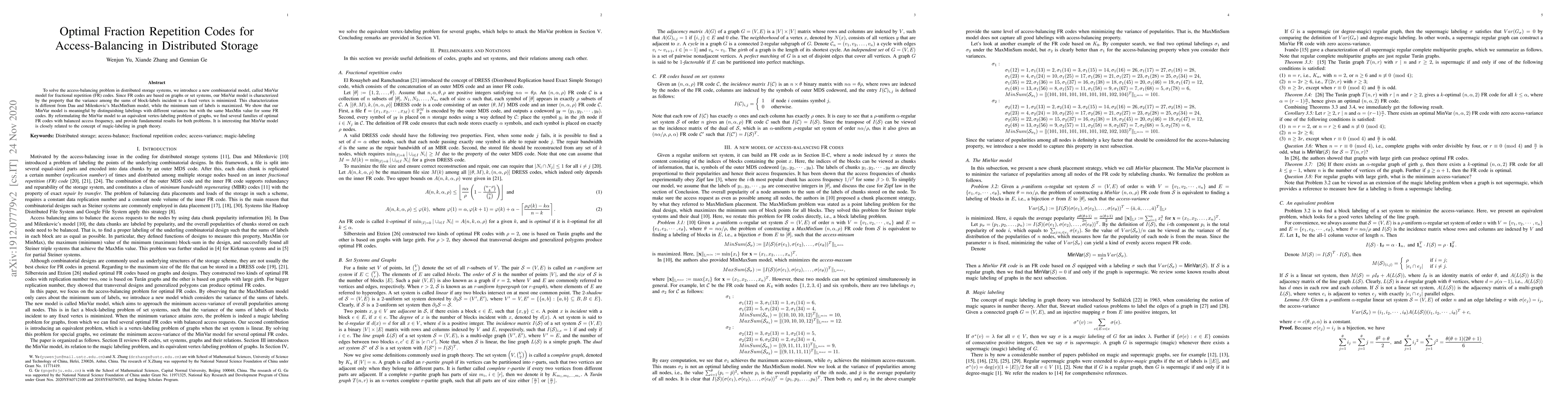 To solve the access-balancing problem in distributed storage systems, we introduce a new combinatorial model, called MinVar model for fractional repetition (FR) codes. Since FR codes are based on graphs or set systems, our MinVar model is characterized by the property that the variance among the sums of block-labels incident to a fixed vertex is minimized. This characterization is different from Dau and Milenkovic's MaxMinSum model, while the minimum sum of labels is maximized. We show that our MinVar model is meaningful by distinguishing labelings with different variances but with the same MaxMin value for some FR codes. By reformulating the MinVar model to an equivalent vertex-labeling problem of graphs, we find several families of optimal FR codes with balanced access frequency, and provide fundamental results for both problems. It is interesting that MinVar model is closely related to the concept of magic-labeling in graph theory.
