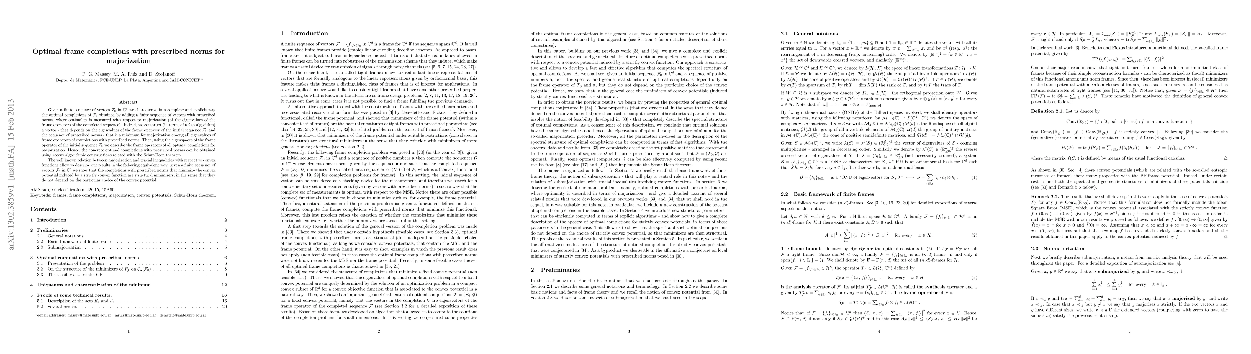 Given a finite sequence of vectors $\mathcal F_0$ in $\C^d$ we characterize in a complete and explicit way the optimal completions of $\mathcal F_0$ obtained by adding a finite sequence of vectors with prescribed norms, where optimality is measured with respect to majorization (of the eigenvalues of the frame operators of the completed sequence). Indeed, we construct (in terms of a fast algorithm) a vector - that depends on the eigenvalues of the frame operator of the initial sequence $\cF_0$ and the sequence of prescribed norms - that is a minimum for majorization among all eigenvalues of frame operators of completions with prescribed norms. Then, using the eigenspaces of the frame operator of the initial sequence $\cF_0$ we describe the frame operators of all optimal completions for majorization. Hence, the concrete optimal completions with prescribed norms can be obtained using recent algorithmic constructions related with the Schur-Horn theorem. The well known relation between majorization and tracial inequalities with respect to convex functions allow to describe our results in the following equivalent way: given a finite sequence of vectors $\mathcal F_0$ in $\C^d$ we show that the completions with prescribed norms that minimize the convex potential induced by a strictly convex function are structural minimizers, in the sense that they do not depend on the particular choice of the convex potential.