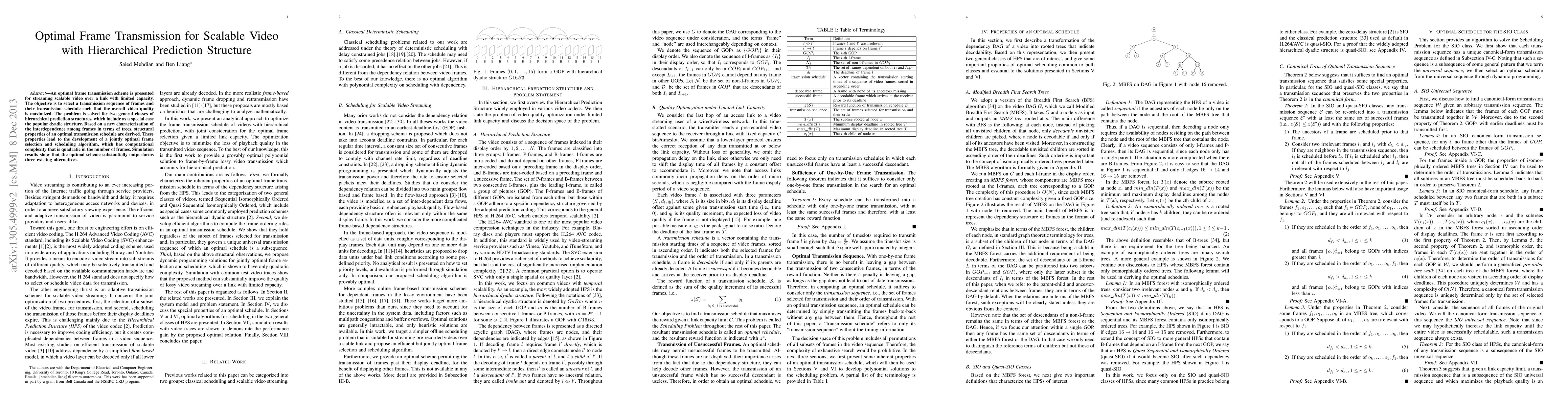 An optimal frame transmission scheme is presented for streaming scalable video over a link with limited capacity. The objective is to select a transmission sequence of frames and their transmission schedule such that the overall video quality is maximized. The problem is solved for two general classes of hierarchical prediction structures, which include as a special case the popular dyadic structure. Based on a new characterization of the interdependence among frames in terms of trees, structural properties of an optimal transmission schedule are derived. These properties lead to the development of a jointly optimal frame selection and scheduling algorithm, which has computational complexity that is quadratic in the number of frames. Simulation results show that the optimal scheme substantially outperforms three existing alternatives.