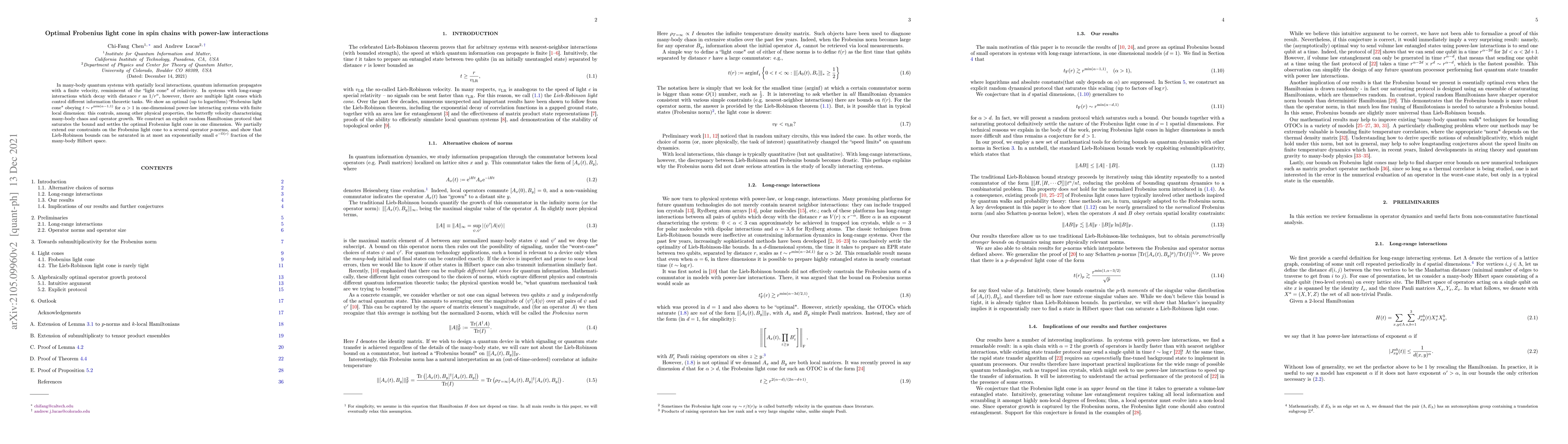 This paper investigates the optimal "Frobenius light cone" in spin chains with power-law interactions, demonstrating that it scales as $t\sim r^{\min(\alpha-1,1)}$ for $\alpha>1$. The authors construct a random Hamiltonian protocol that saturates this bound, controlling the butterfly velocity and many-body chaos.
