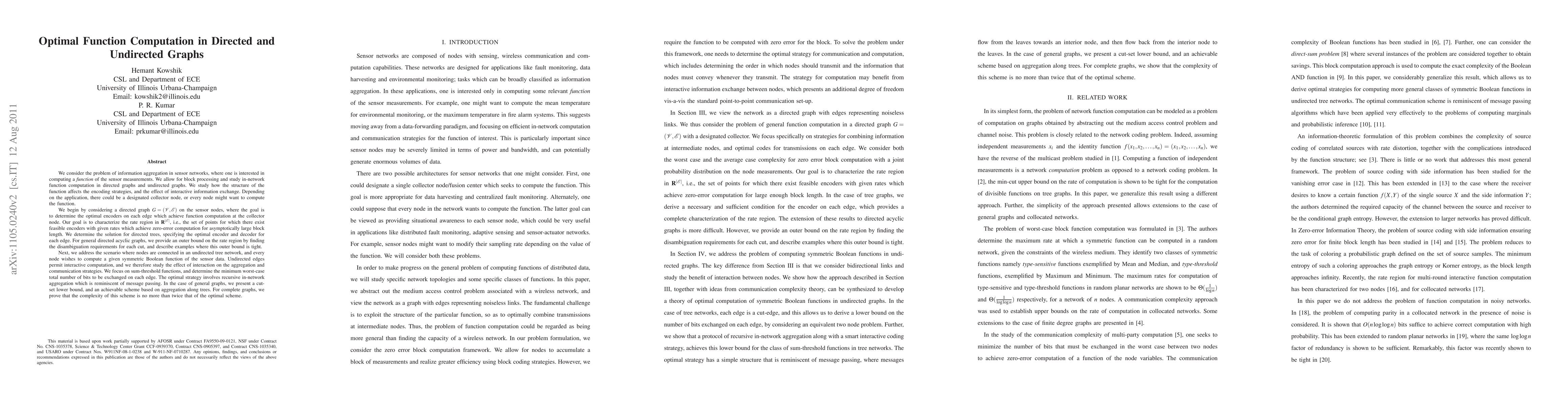This paper explores optimal function computation in directed and undirected graphs for sensor networks, focusing on information aggregation. It determines optimal encoders for directed trees and provides an outer bound for general directed acyclic graphs, while for undirected trees, it finds the minimum bits exchanged for sum-threshold functions, and presents bounds and schemes for general and complete graphs.