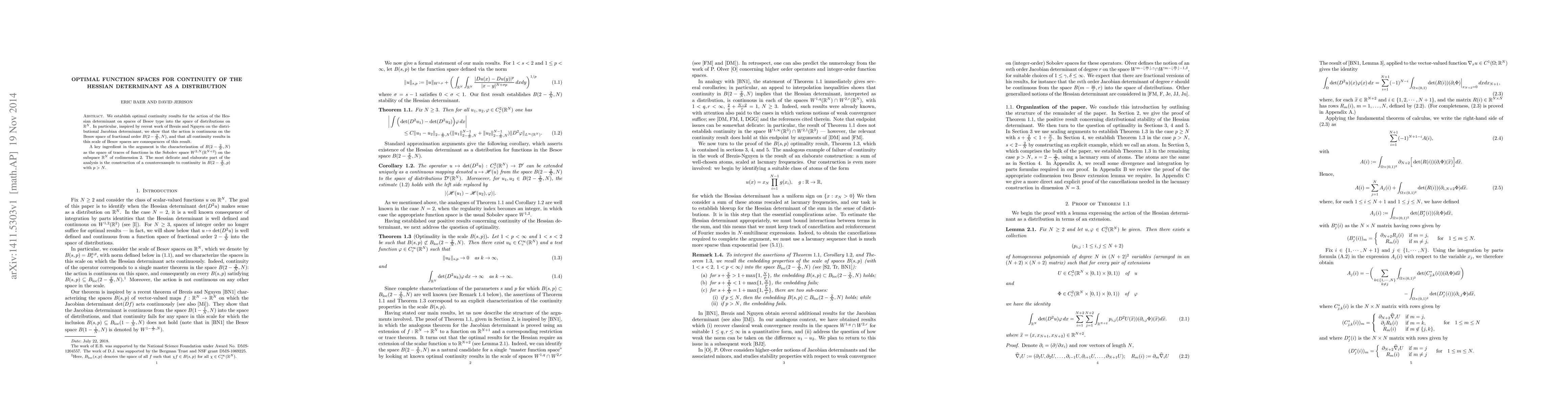 We establish optimal continuity results for the action of the Hessian determinant on spaces of Besov type into the space of distributions on $\mathbb{R}^N$. In particular, inspired by recent work of Brezis and Nguyen on the distributional Jacobian determinant, we show that the action is continuous on the Besov space of fractional order $B(2-\frac{2}{N},N)$, and that all continuity results in this scale of Besov spaces are consequences of this result. A key ingredient in the argument is the characterization of $B(2-\frac{2}{N},N)$ as the space of traces of functions in the Sobolev space $W^{2,N}(\mathbb{R}^{N+2})$ on the subspace $\mathbb{R}^N$ of codimension $2$. The most delicate and elaborate part of the analysis is the construction of a counterexample to continuity in $B(2-\frac{2}{N},p)$ with $p>N$.