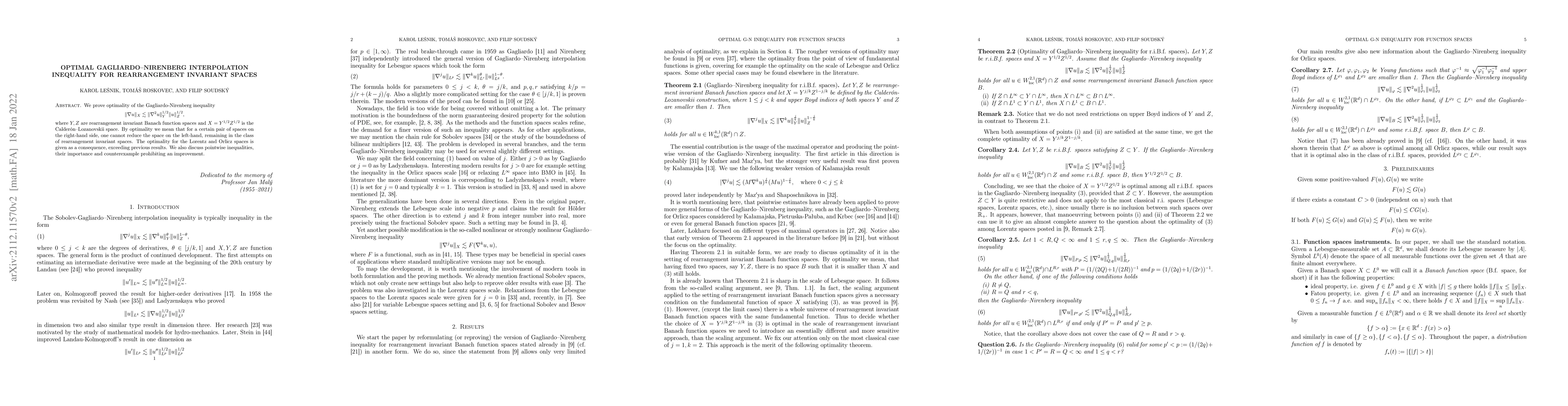 We prove optimality of the Gagliardo-Nirenberg inequality $$ \|\nabla u\|_{X}\lesssim\|\nabla^2 u\|_Y^{1/2}\|u\|_Z^{1/2}, $$ where $Y, Z$ are rearrangement invariant Banach function spaces and $X=Y^{1/2}Z^{1/2}$ is the Calder\'on--Lozanovskii space. By optimality, we mean that for a certain pair of spaces on the right-hand side, one cannot reduce the space on the left-hand, remaining in the class of rearrangement invariant spaces. The optimality for the Lorentz and Orlicz spaces is given as a consequence, exceeding previous results. We also discuss pointwise inequalities, their importance and counterexample prohibiting an improvement.