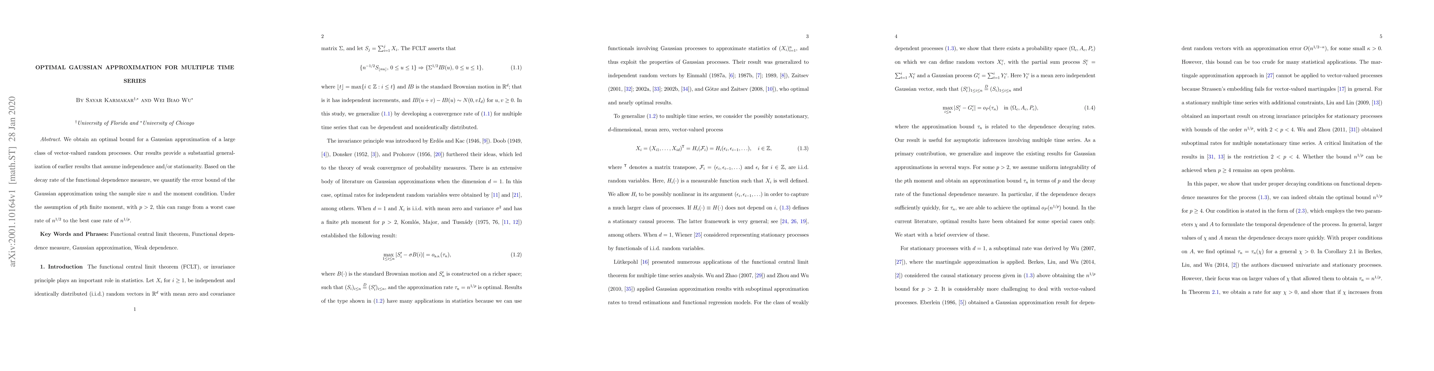 We obtain an optimal bound for a Gaussian approximation of a large class of vector-valued random processes. Our results provide a substantial generalization of earlier results that assume independence and/or stationarity. Based on the decay rate of the functional dependence measure, we quantify the error bound of the Gaussian approximation using the sample size $n$ and the moment condition. Under the assumption of $p$th finite moment, with $p>2$, this can range from a worst case rate of $n^{1/2}$ to the best case rate of $n^{1/p}$.