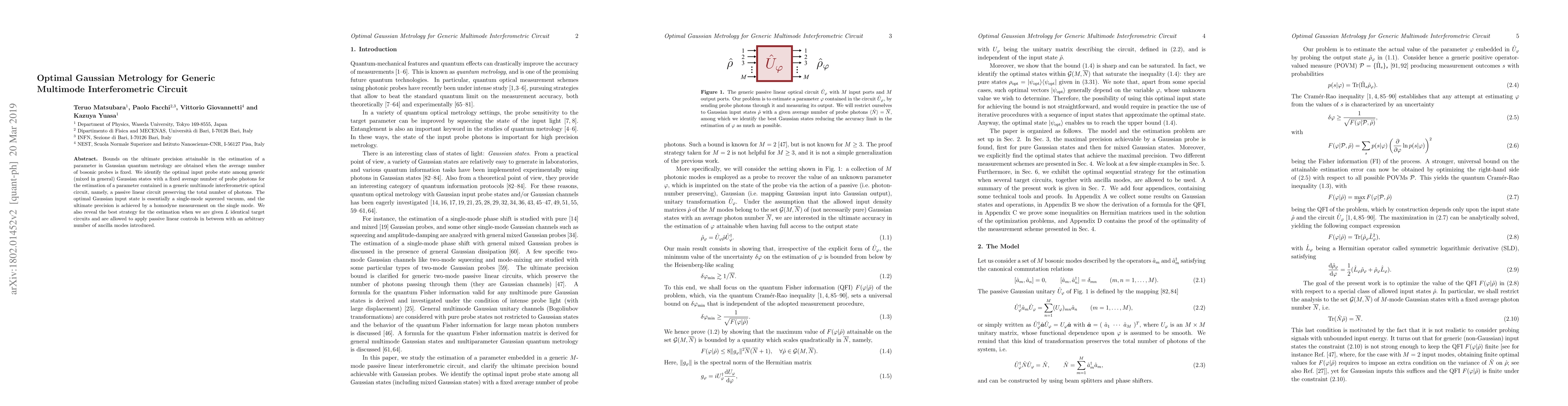 This paper determines the optimal Gaussian state for achieving maximum precision in parameter estimation in multimode interferometric circuits, identifying a single-mode squeezed vacuum as the best input state, and proposes a homodyne measurement strategy. It also explores the best estimation strategy when multiple identical circuits are available with the option to introduce ancilla modes.