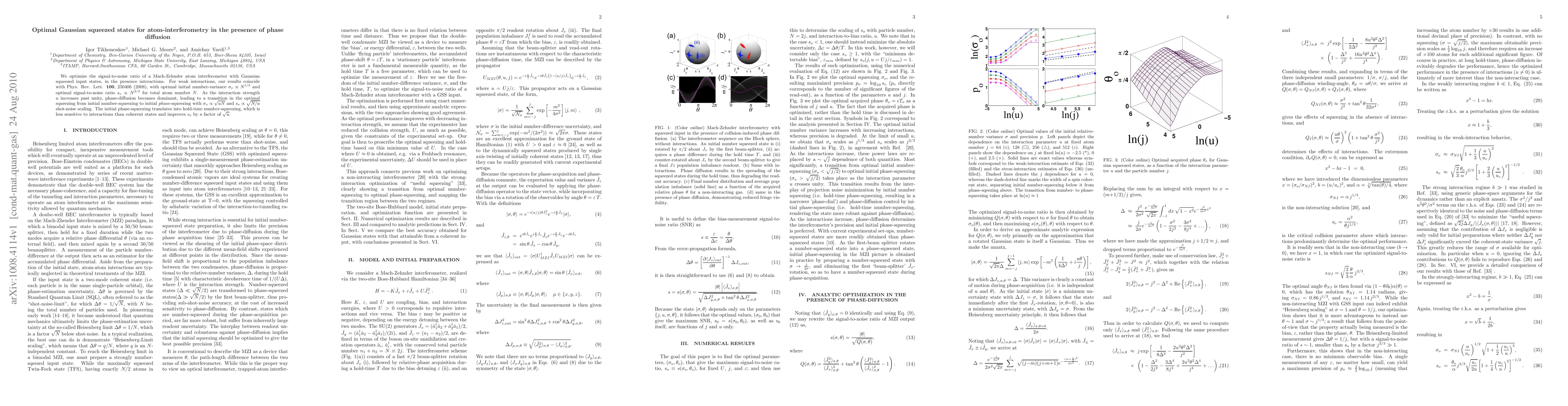Research optimizes Gaussian squeezed states for atom interferometry with weak interactions, finding optimal signal-to-noise ratio proportional to N^(2/3), then transitions to phase-squeezing at stronger interactions, improving sensitivity by sqrt(u).