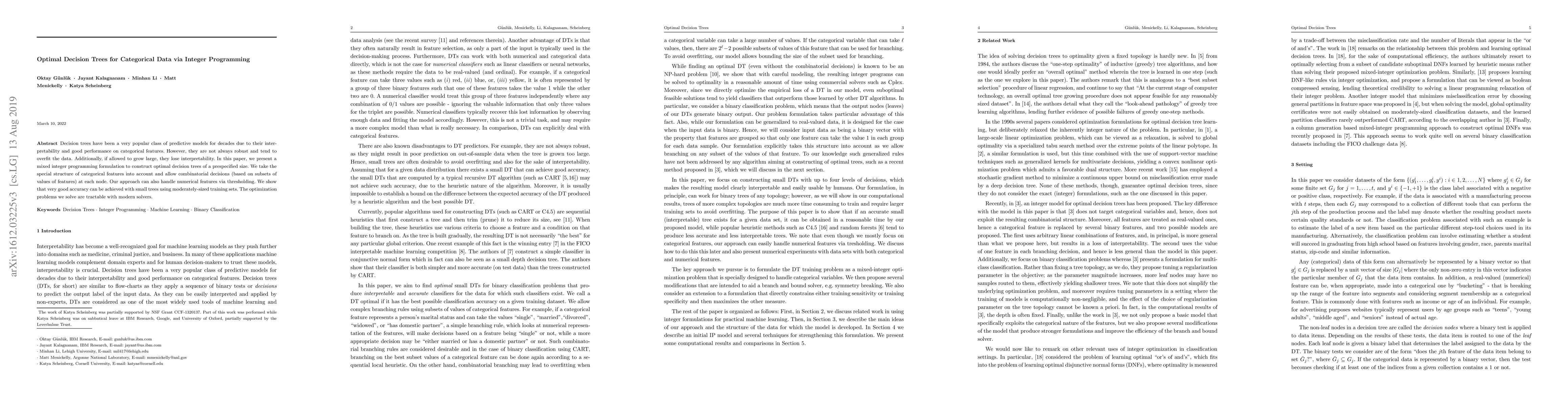 Decision trees have been a very popular class of predictive models for decades due to their interpretability and good performance on categorical features. However, they are not always robust and tend to overfit the data. Additionally, if allowed to grow large, they lose interpretability. In this paper, we present a mixed integer programming formulation to construct optimal decision trees of a prespecified size. We take the special structure of categorical features into account and allow combinatorial decisions (based on subsets of values of features) at each node. Our approach can also handle numerical features via thresholding. We show that very good accuracy can be achieved with small trees using moderately-sized training sets. The optimization problems we solve are tractable with modern solvers.