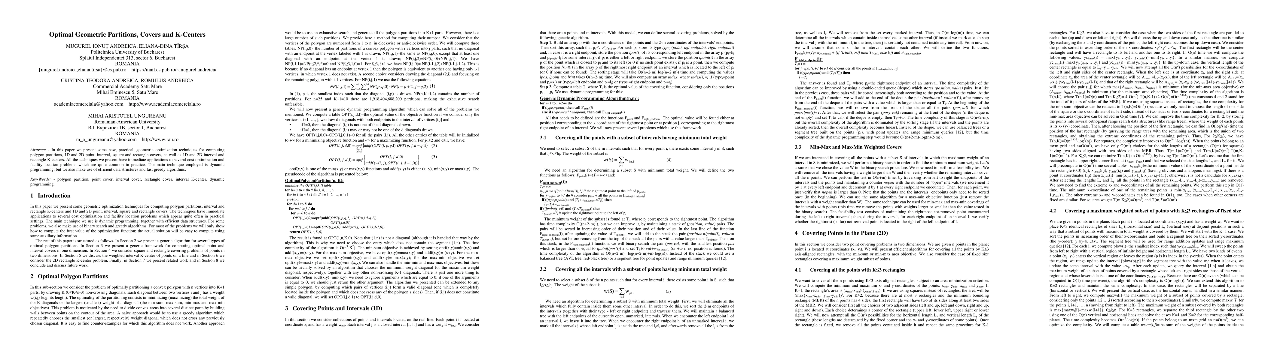 This paper introduces new geometric optimization techniques for partitioning polygons, covers, and K-centers using dynamic programming and efficient data structures, with applications in cost optimization and facility location problems.