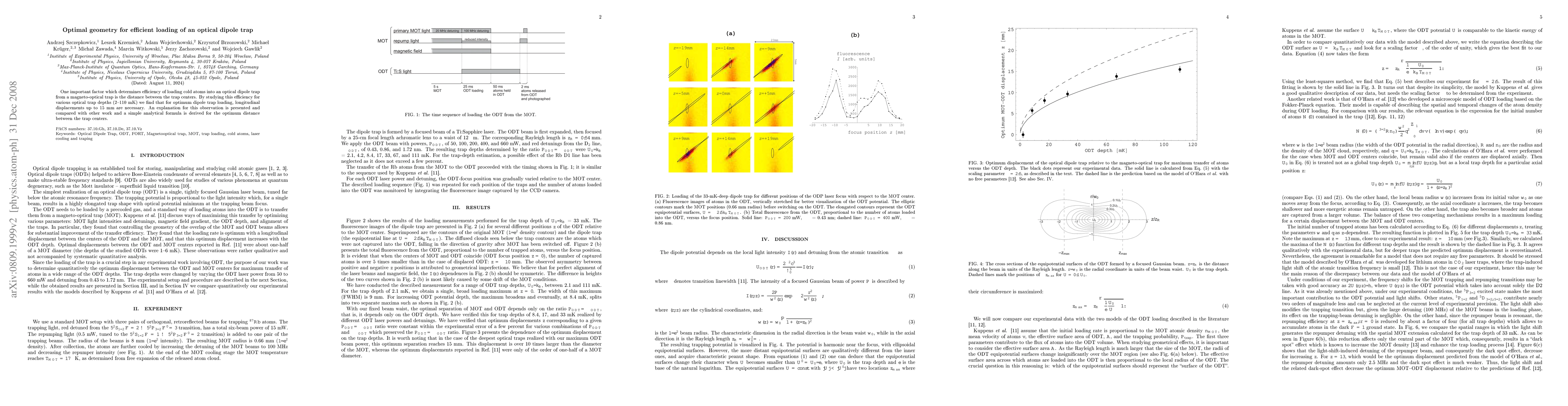 This study investigates the optimal geometry for efficiently loading cold atoms into an optical dipole trap from a magneto-optical trap, finding that longitudinal displacements up to 15 mm are necessary for optimal loading efficiency. The research derives a simple analytical formula for the optimum distance between trap centers.