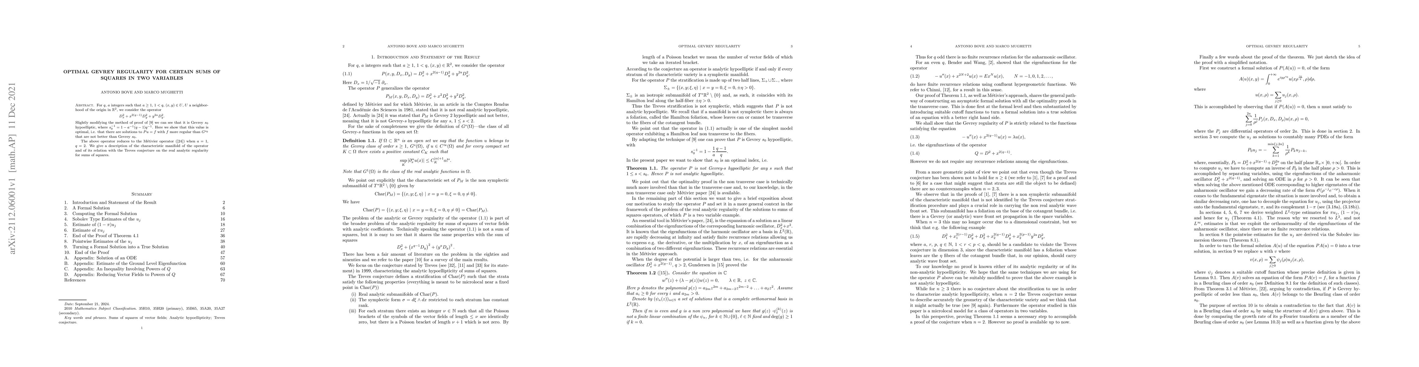 This paper investigates the optimal Gevrey regularity for a specific operator involving sums of squares in two variables, proving it is Gevrey $s_0$ hypoelliptic with $s_0^{-1} = 1 - a^{-1}(q-1)q^{-1}$. It demonstrates that this regularity is optimal by showing solutions to the operator's equations cannot be more regular than Gevrey $s_0$.