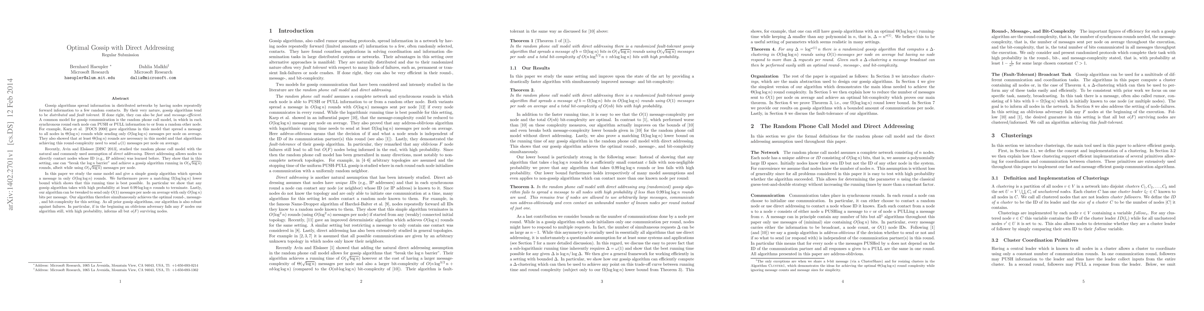 This paper presents an optimal gossip algorithm in the direct addressing model, achieving message spreading in $O(\log \log n)$ rounds, with a matching lower bound, and using only $O(1)$ messages per node on average. The algorithm is also shown to be optimal in terms of bit complexity and robust against node failures.