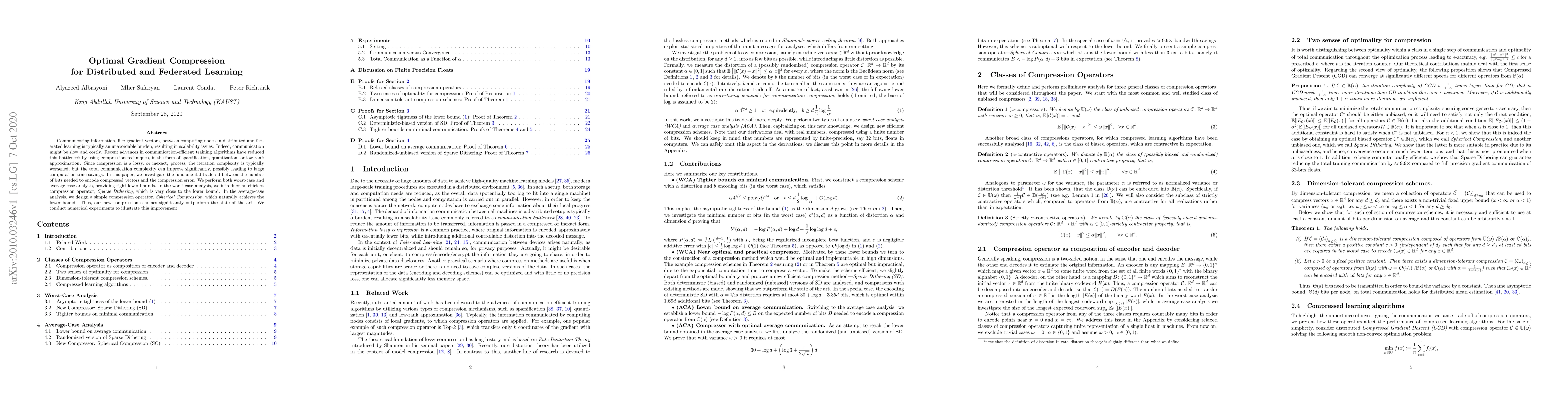 Communicating information, like gradient vectors, between computing nodes in distributed and federated learning is typically an unavoidable burden, resulting in scalability issues. Indeed, communication might be slow and costly. Recent advances in communication-efficient training algorithms have reduced this bottleneck by using compression techniques, in the form of sparsification, quantization, or low-rank approximation. Since compression is a lossy, or inexact, process, the iteration complexity is typically worsened; but the total communication complexity can improve significantly, possibly leading to large computation time savings. In this paper, we investigate the fundamental trade-off between the number of bits needed to encode compressed vectors and the compression error. We perform both worst-case and average-case analysis, providing tight lower bounds. In the worst-case analysis, we introduce an efficient compression operator, Sparse Dithering, which is very close to the lower bound. In the average-case analysis, we design a simple compression operator, Spherical Compression, which naturally achieves the lower bound. Thus, our new compression schemes significantly outperform the state of the art. We conduct numerical experiments to illustrate this improvement.