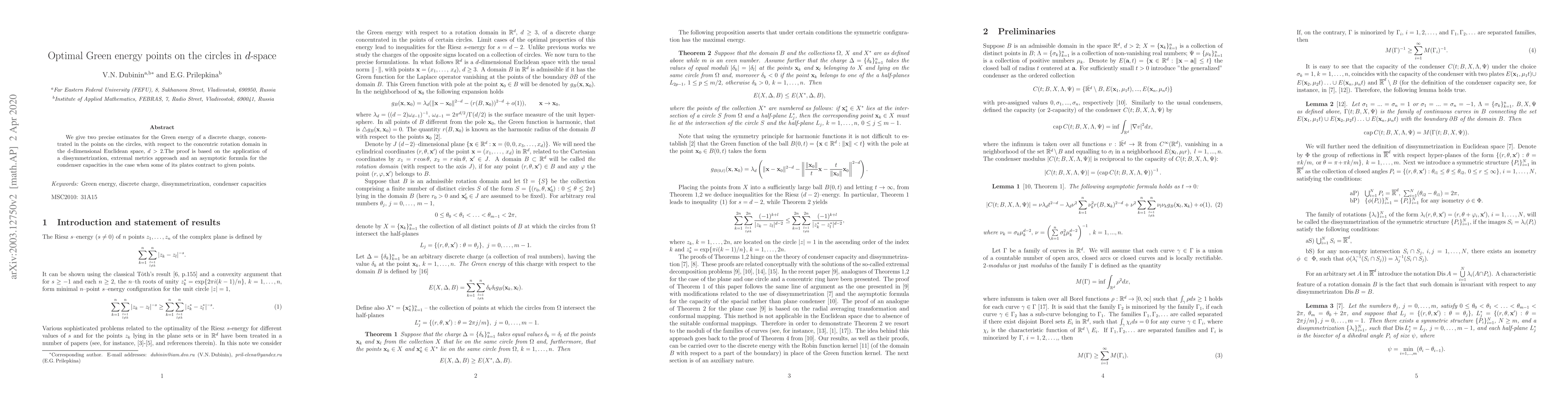 Researchers provide precise estimates for Green energy in d-dimensional space, focusing on discrete charges concentrated on circles, with a dissymmetrization approach and asymptotic formula.