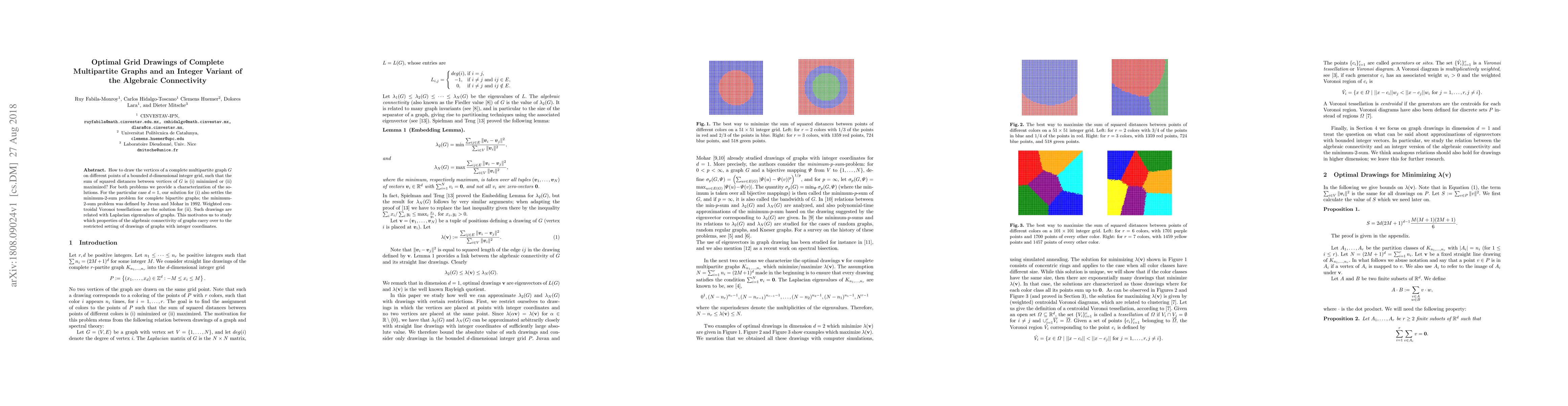 This paper studies optimal grid drawings of complete multipartite graphs to minimize or maximize the sum of squared distances between vertices, providing characterizations for both cases. For $d=1$, it resolves the minimum-2-sum problem for complete bipartite graphs. Weighted centroidal Voronoi tessellations solve the maximization problem, and the study extends to the algebraic connectivity of graphs with integer coordinates.