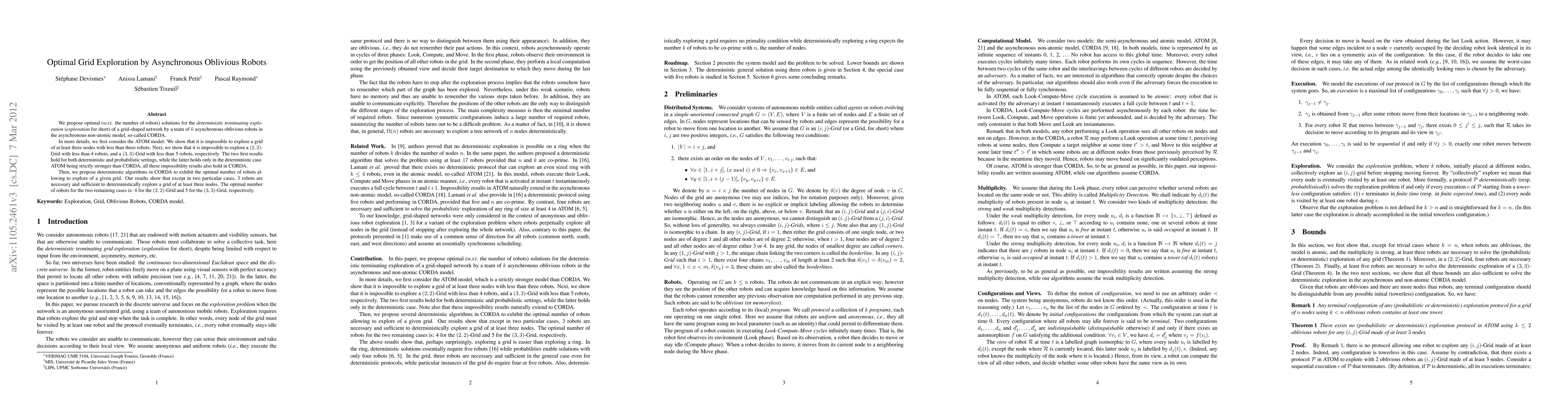 This paper explores optimal grid exploration strategies for a team of autonomous, anonymous, and oblivious robots operating asynchronously on an anonymous unoriented grid. It demonstrates that at least three robots are generally required to explore grids of at least three nodes, with specific configurations requiring four or five robots for smaller grids. The study proposes deterministic algorithms to achieve optimal exploration under the CORDA model.