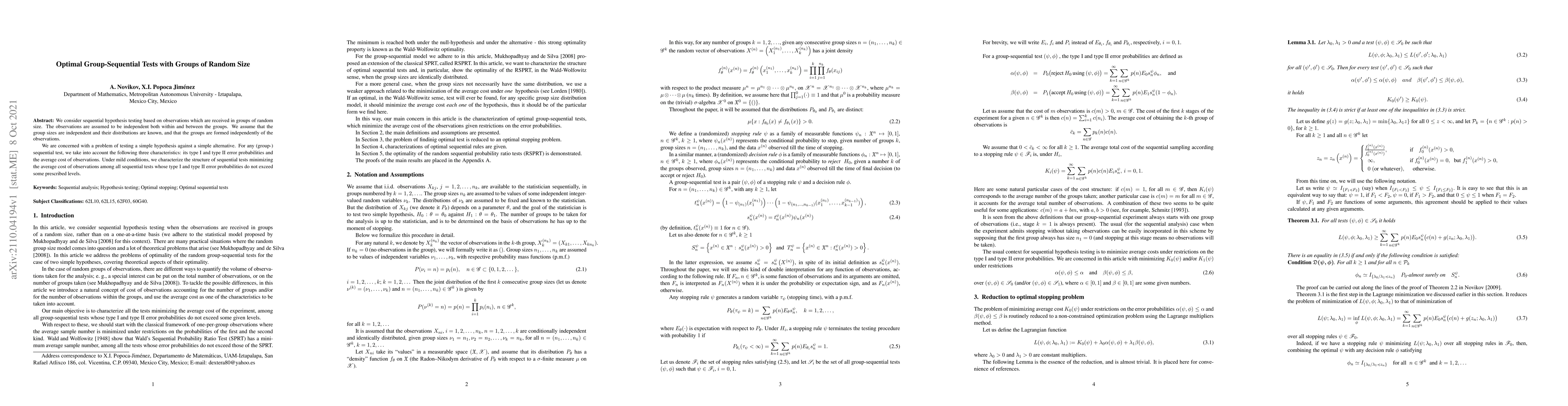 This paper investigates optimal group-sequential tests for hypotheses where observations arrive in groups of random size. It characterizes the structure of tests minimizing average observation cost while maintaining prescribed error probabilities.