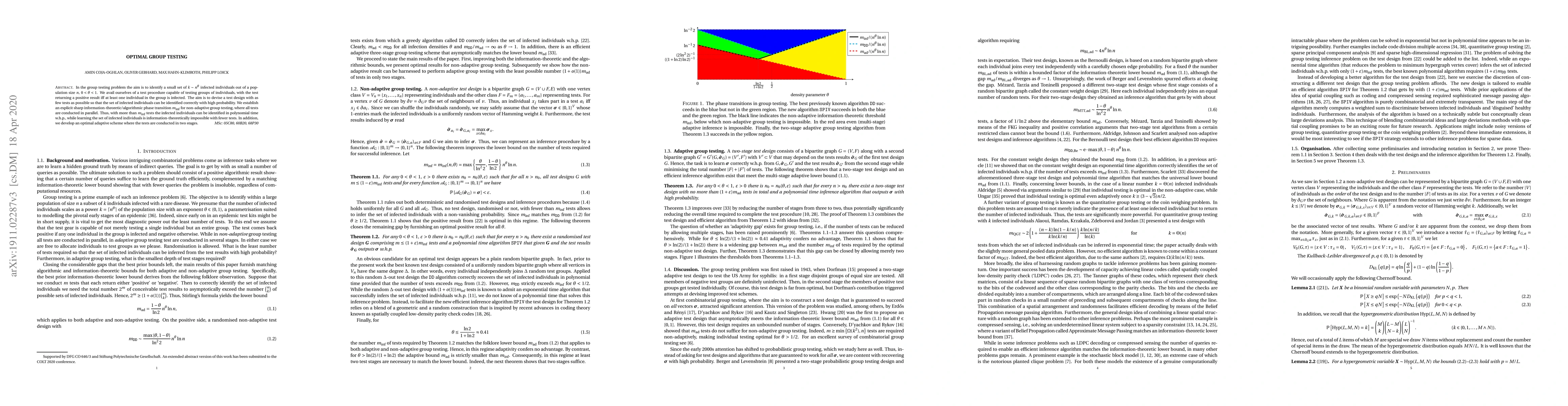 This paper investigates optimal strategies for group testing to identify a small number of infected individuals within a larger population using tests that can evaluate groups of individuals. It establishes a sharp information-theoretic threshold for non-adaptive testing and develops an optimal adaptive two-stage testing scheme.