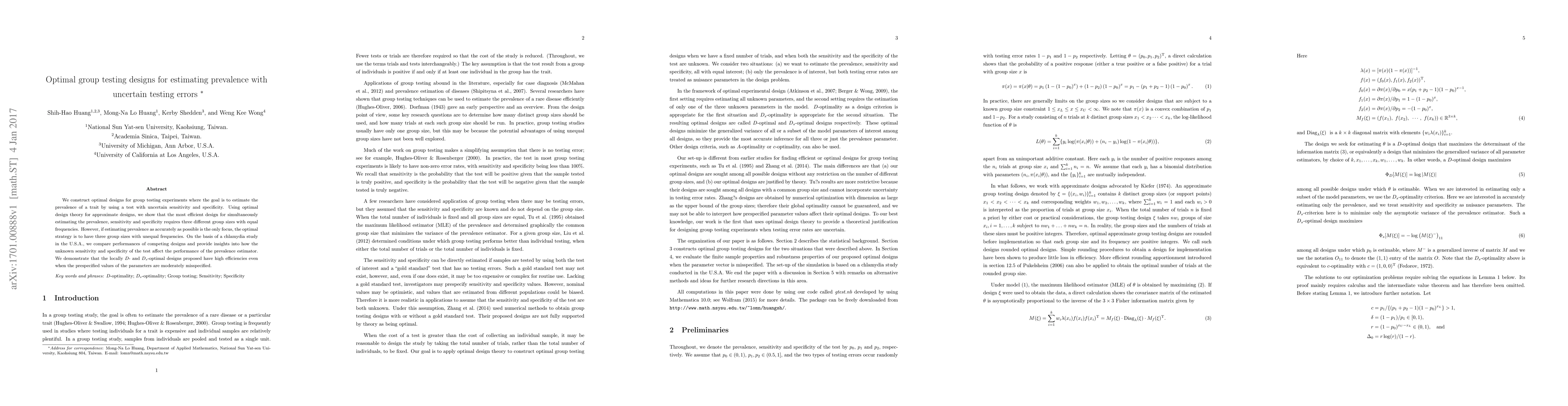 We construct optimal designs for group testing experiments where the goal is to estimate the prevalence of a trait by using a test with uncertain sensitivity and specificity. Using optimal design theory for approximate designs, we show that the most efficient design for simultaneously estimating the prevalence, sensitivity and specificity requires three different group sizes with equal frequencies. However, if estimating prevalence as accurately as possible is the only focus, the optimal strategy is to have three group sizes with unequal frequencies. On the basis of a chlamydia study in the U.S.A., we compare performances of competing designs and provide insights into how the unknown sensitivity and specificity of the test affect the performance of the prevalence estimator. We demonstrate that the locally D- and Ds-optimal designs proposed have high efficiencies even when the prespecified values of the parameters are moderately misspecified.