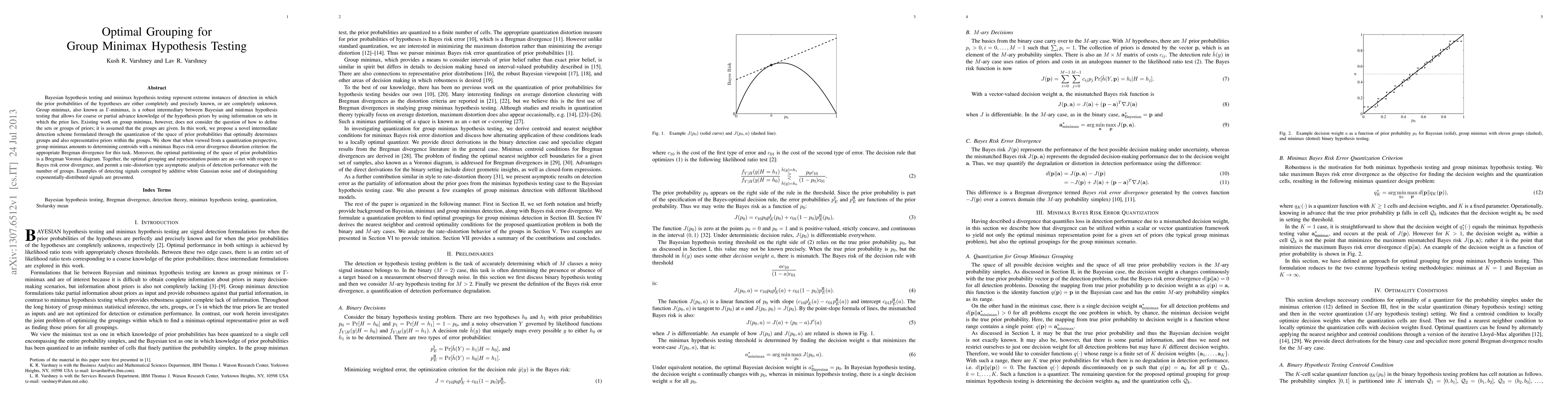 This paper proposes a novel method for optimal grouping in group minimax hypothesis testing, introducing a quantization-based approach to determine the best groups and representative priors. The optimal partitioning is shown to be a Bregman Voronoi diagram, enabling an asymptotic analysis of detection performance with increasing group numbers.