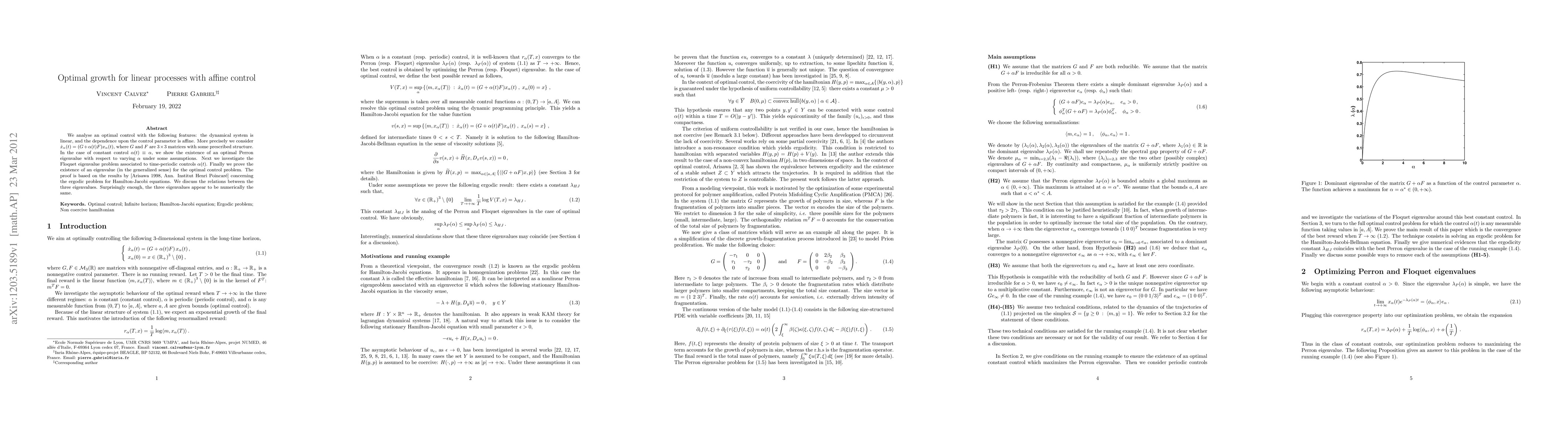 This paper investigates optimal control for linear processes with affine control, showing that three eigenvalues can numerically match under certain conditions, leading to potentially unique optimal growth strategies.