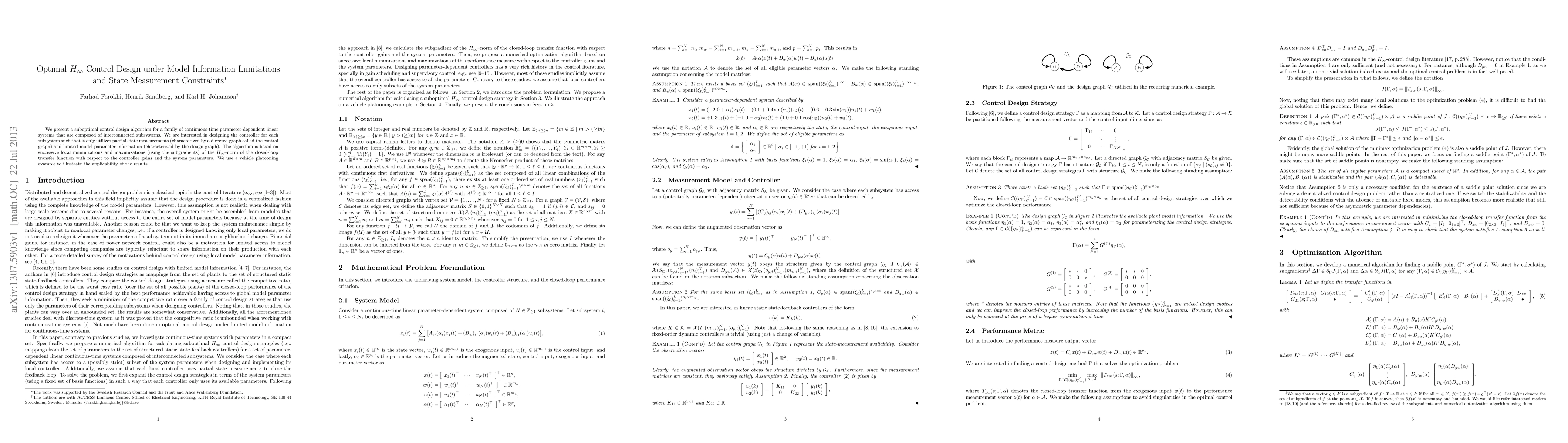 We present a suboptimal control design algorithm for a family of continuous-time parameter-dependent linear systems that are composed of interconnected subsystems. We are interested in designing the controller for each subsystem such that it only utilizes partial state measurements (characterized by a directed graph called the control graph) and limited model parameter information (characterized by the design graph). The algorithm is based on successive local minimizations and maximizations (using the subgradients) of the $H_\infty$--norm of the closed-loop transfer function with respect to the controller gains and the system parameters. We use a vehicle platooning example to illustrate the applicability of the results.