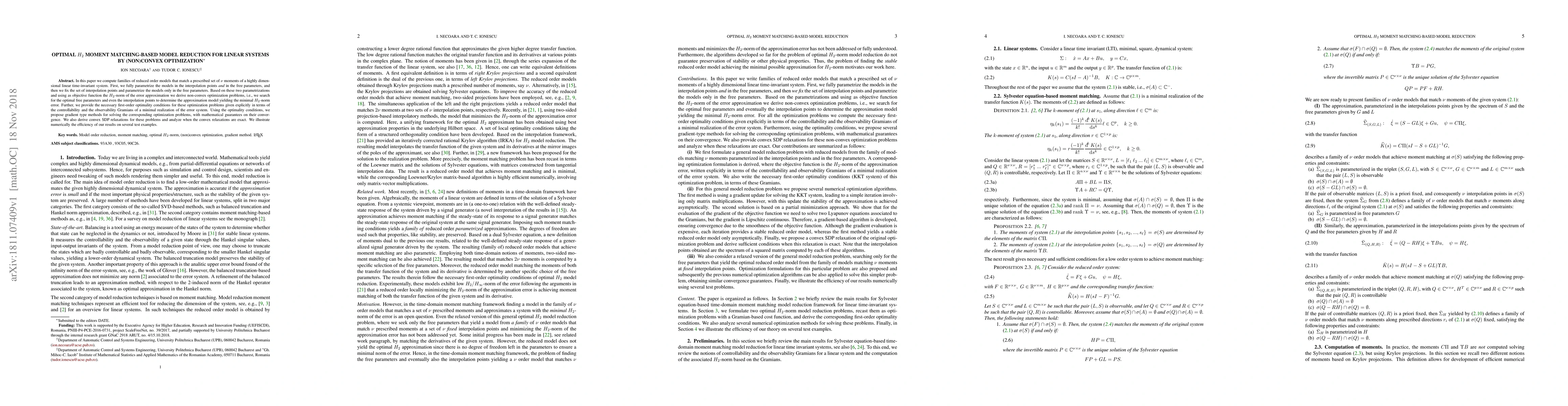 In this paper we compute families of reduced order models that match a prescribed set of moments of a highly dimensional linear time-invariant system. First, we fully parametrize the models in the interpolation points and in the free parameters, and then we fix the set of interpolation points and parametrize the models only in the free parameters. Based on these two parametrizations and using as objective function the H2-norm of the error approximation we derive non-convex optimization problems, i.e., we search for the optimal free parameters and even the interpolation points to determine the approximation model yielding the minimal H2-norm error. Further, we provide the necessary first-order optimality conditions for these optimization problems given explicitly in terms of the controllability and the observability Gramians of a minimal realization of the error system. Using the optimality conditions, we propose gradient type methods for solving the corresponding optimization problems, with mathematical guarantees on their convergence. We also derive convex SDP relaxations for these problems and analyze when the convex relaxations are exact. We illustrate numerically the efficiency of our results on several test examples.