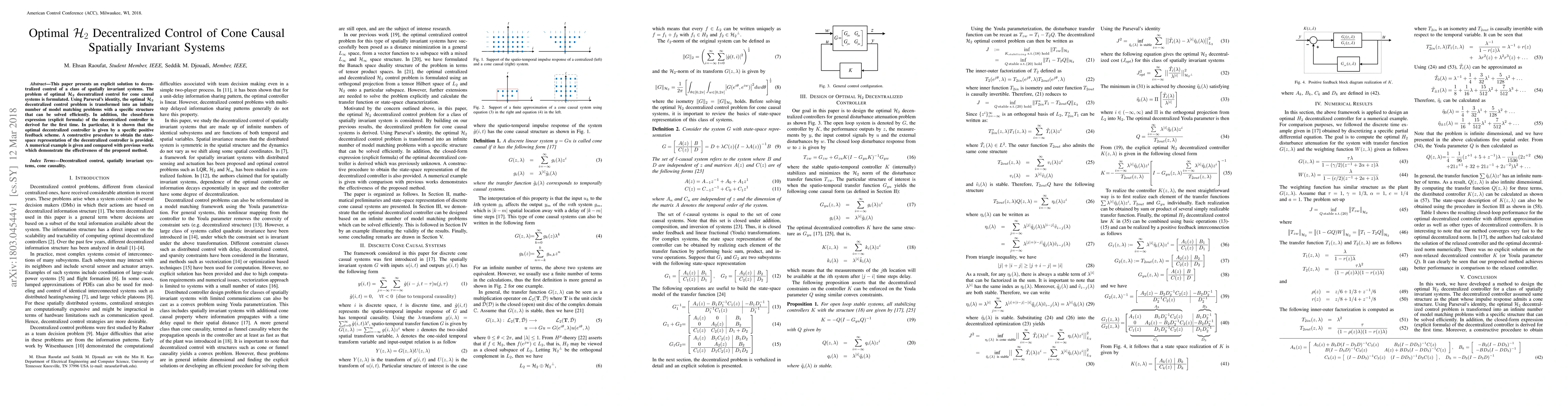 This paper presents an explicit solution to decentralized control of a class of spatially invariant systems. The problem of optimal $H_2$ decentralized control for cone causal systems is formulated. Using Parseval's identity, the optimal $H_2$ decentralized control problem is transformed into an infinite number of model matching problems with a specific structure that can be solved efficiently. In addition, the closed-form expression (explicit formula) of the decentralized controller is derived for the first time. In particular, it is shown that the optimal decentralized controller is given by a specific positive feedback scheme. A constructive procedure to obtain the state-space representation of the decentralized controller is provided. A numerical example is given and compared with previous works which demonstrate the effectiveness of the proposed method.