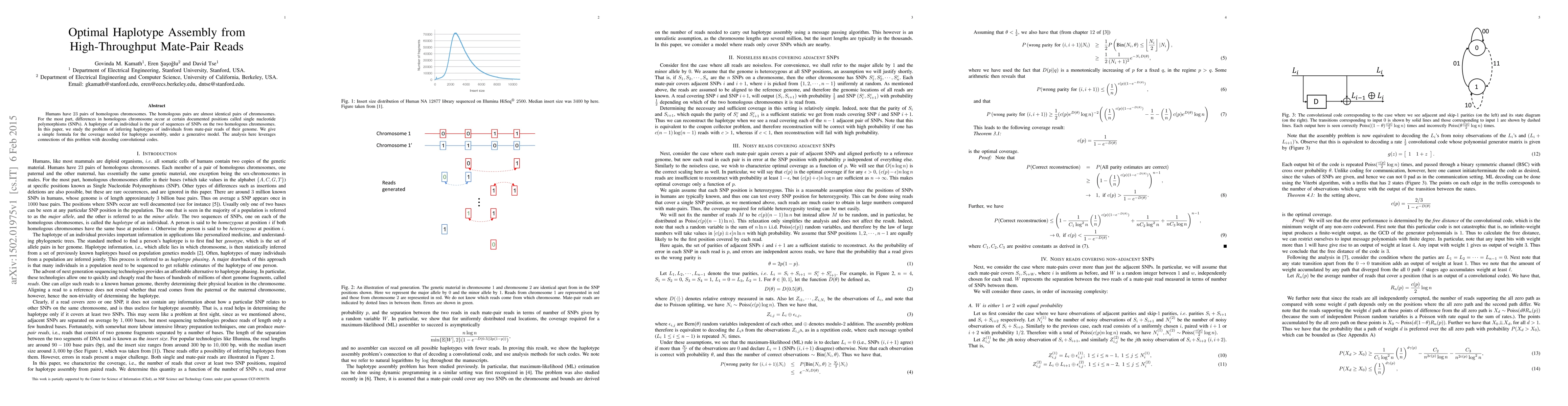 This paper addresses the challenge of inferring haplotypes from high-throughput mate-pair reads, providing a formula for optimal coverage needed for accurate assembly. It leverages connections with decoding convolutional codes to enhance the analysis.