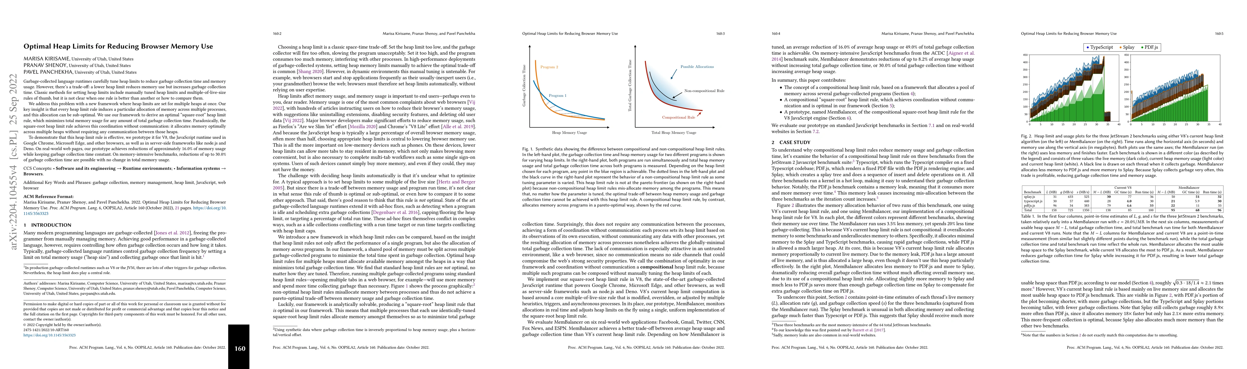 This paper proposes a new framework for setting optimal heap limits in garbage-collected language runtimes to minimize memory usage without increasing garbage collection time. The authors derive a "square-root" heap limit rule that achieves this balance and demonstrate its effectiveness in reducing memory usage by approximately 16.0% on real-world web pages while maintaining constant garbage collection time.