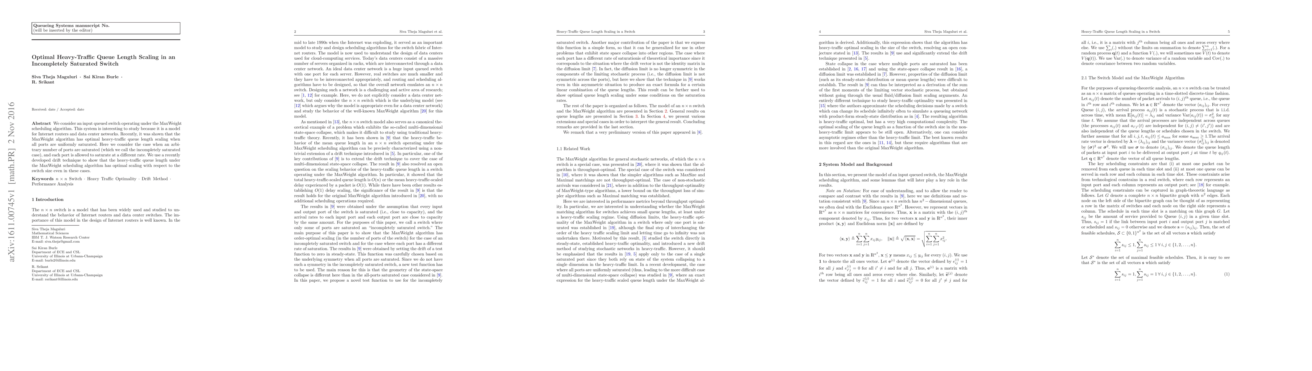 This paper investigates the MaxWeight scheduling algorithm in an input queued switch under incompletely saturated conditions, demonstrating optimal heavy-traffic queue length scaling with respect to switch size using a drift technique. The findings extend beyond uniformly saturated ports to arbitrary saturation rates.