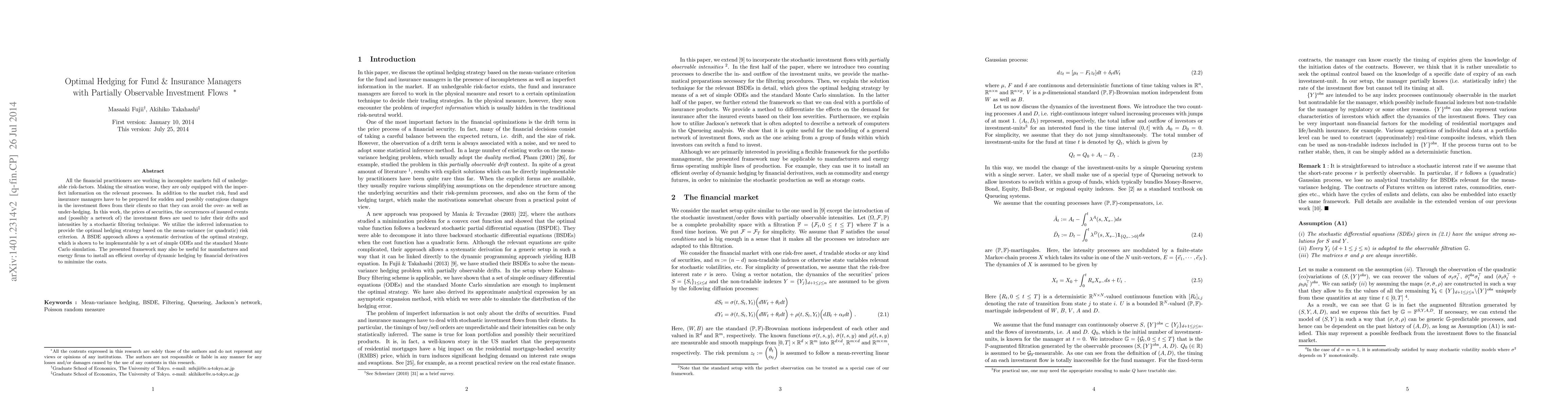 This paper develops an optimal hedging strategy for fund and insurance managers dealing with unhedgeable market risks and imperfect information on investment flows. It uses stochastic filtering to infer drifts and intensities from security prices, insured events, and investment flows, and derives the optimal hedging strategy via a BSDE approach, implementable through ODEs and Monte Carlo simulation.