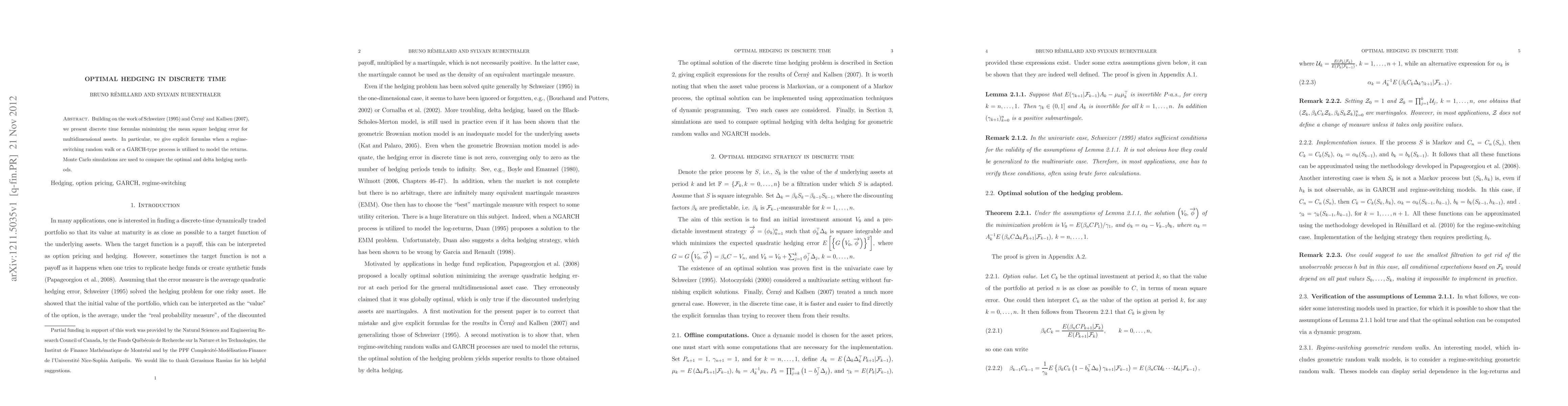 Building on the work of Schweizer (1995) and Cern and Kallseny (2007), we present discrete time formulas minimizing the mean square hedging error for multidimensional assets. In particular, we give explicit formulas when a regime-switching random walk or a GARCH-type process is utilized to model the returns. Monte Carlo simulations are used to compare the optimal and delta hedging methods.