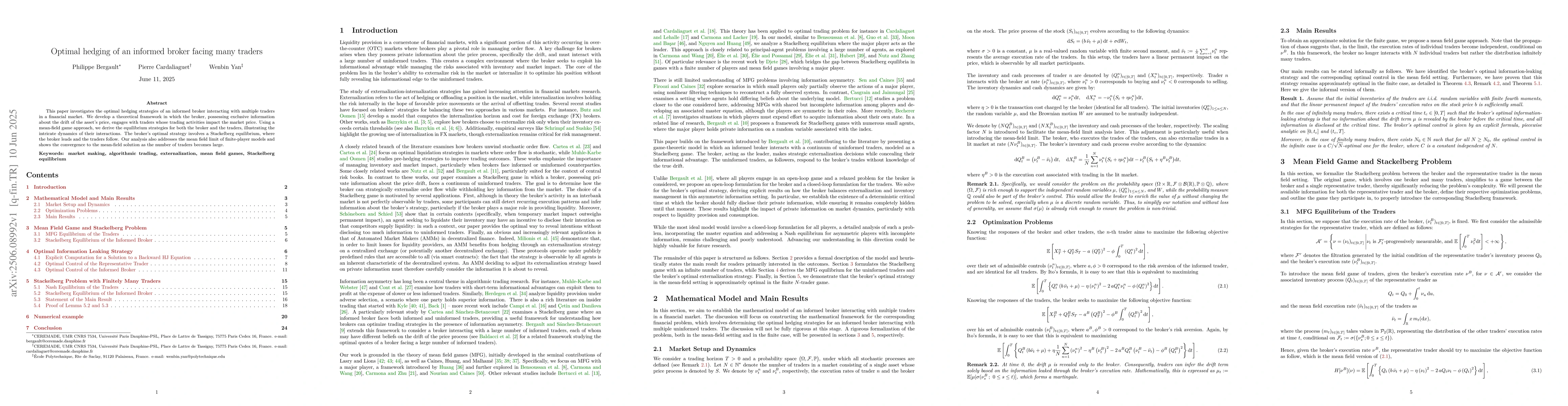 This paper investigates the optimal hedging strategies of an informed broker interacting with multiple traders in a financial market. We develop a theoretical framework in which the broker, possessing exclusive information about the drift of the asset's price, engages with traders whose trading activities impact the market price. Using a mean-field game approach, we derive the equilibrium strategies for both the broker and the traders, illustrating the intricate dynamics of their interactions. The broker's optimal strategy involves a Stackelberg equilibrium, where the broker leads and the traders follow. Our analysis also addresses the mean field limit of finite-player models and shows the convergence to the mean-field solution as the number of traders becomes large.