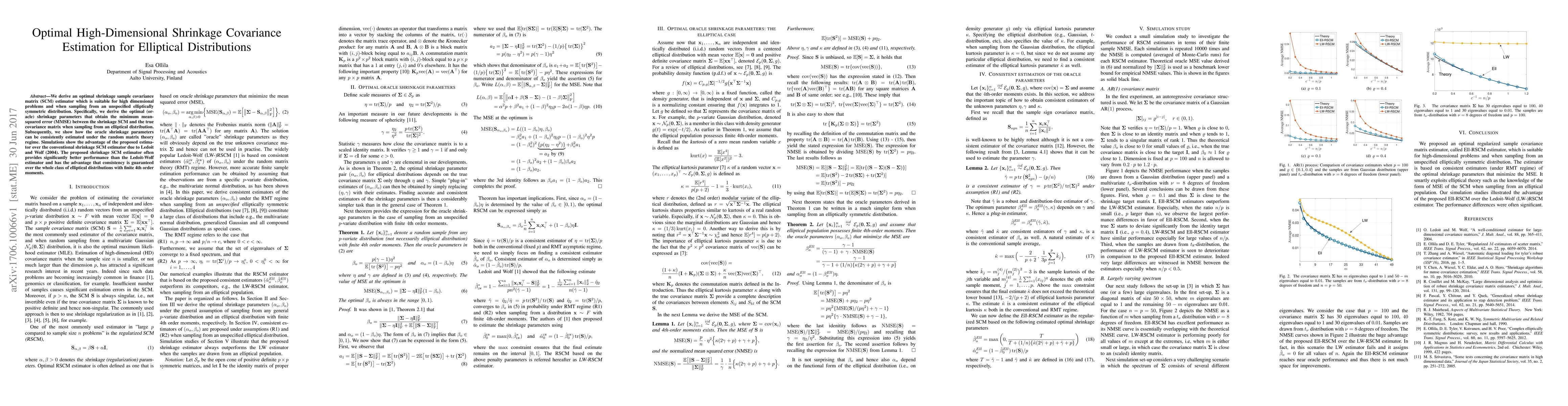 This paper proposes an optimal shrinkage estimator for high-dimensional covariance matrices under elliptical distributions, deriving the best shrinkage parameters for minimum mean-squared error. It demonstrates superior performance over the Ledoit-Wolf estimator through simulations and guarantees consistency across elliptical distributions.