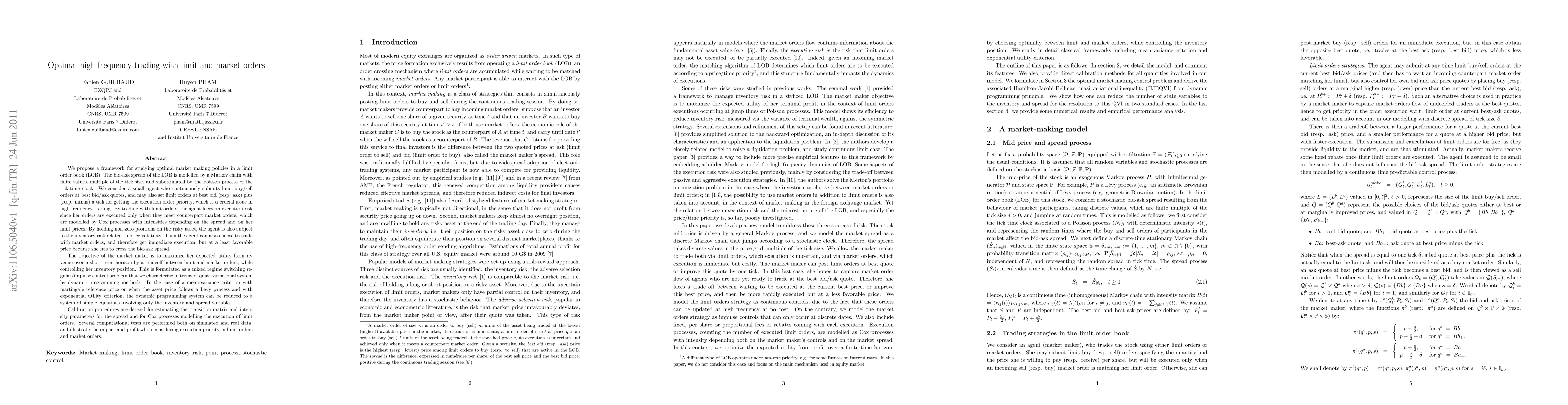 We propose a framework for studying optimal market making policies in a limit order book (LOB). The bid-ask spread of the LOB is modelled by a Markov chain with finite values, multiple of the tick size, and subordinated by the Poisson process of the tick-time clock. We consider a small agent who continuously submits limit buy/sell orders and submits market orders at discrete dates. The objective of the market maker is to maximize her expected utility from revenue over a short term horizon by a tradeoff between limit and market orders, while controlling her inventory position. This is formulated as a mixed regime switching regular/ impulse control problem that we characterize in terms of quasi-variational system by dynamic programming methods. In the case of a mean-variance criterion with martingale reference price or when the asset price follows a Levy process and with exponential utility criterion, the dynamic programming system can be reduced to a system of simple equations involving only the inventory and spread variables. Calibration procedures are derived for estimating the transition matrix and intensity parameters for the spread and for Cox processes modelling the execution of limit orders. Several computational tests are performed both on simulated and real data, and illustrate the impact and profit when considering execution priority in limit orders and market orders