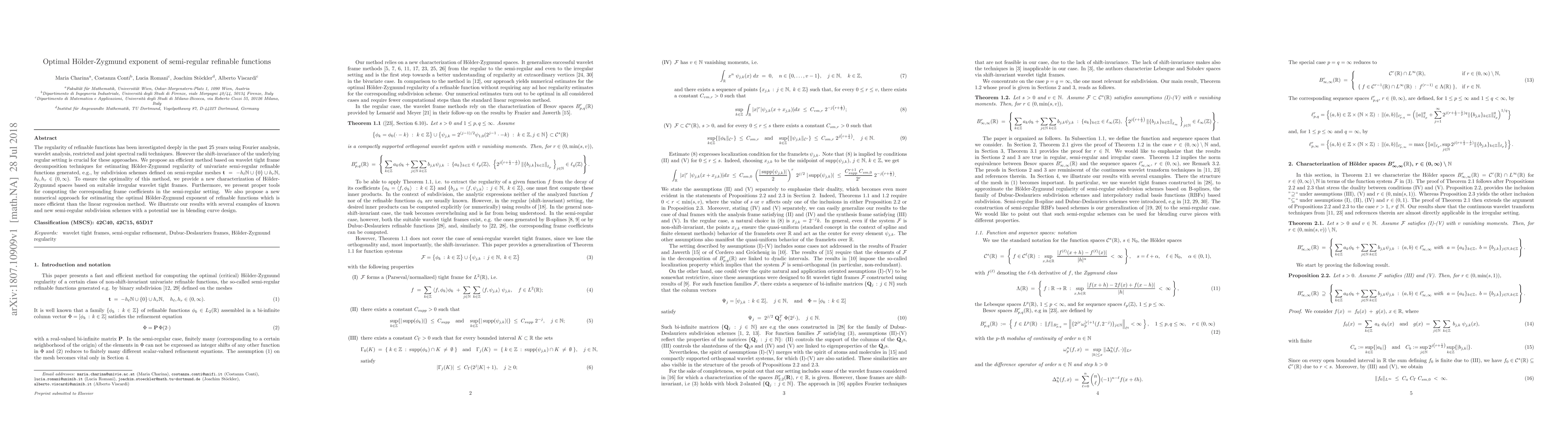 The regularity of refinable functions has been investigated deeply in the past 25 years using Fourier analysis, wavelet analysis, restricted and joint spectral radii techniques. However the shift-invariance of the underlying regular setting is crucial for these approaches. We propose an efficient method based on wavelet tight frame decomposition techniques for estimating H\"older-Zygmund regularity of univariate semi-regular refinable functions generated, e.g., by subdivision schemes defined on semi-regular meshes $\mathbf{t}\;=\;-h_\ell\mathbb{N}\cup\{0\}\cup h_r\mathbb{N}$, $h_\ell,h_r \in (0,\infty)$. To ensure the optimality of this method, we provide a new characterization of H\"older-Zygmund spaces based on suitable irregular wavelet tight frames. Furthermore, we present proper tools for computing the corresponding frame coefficients in the semi-regular setting. We also propose a new numerical approach for estimating the optimal H\"older-Zygmund exponent of refinable functions which is more efficient than the linear regression method. We illustrate our results with several examples of known and new semi-regular subdivision schemes with a potential use in blending curve design.