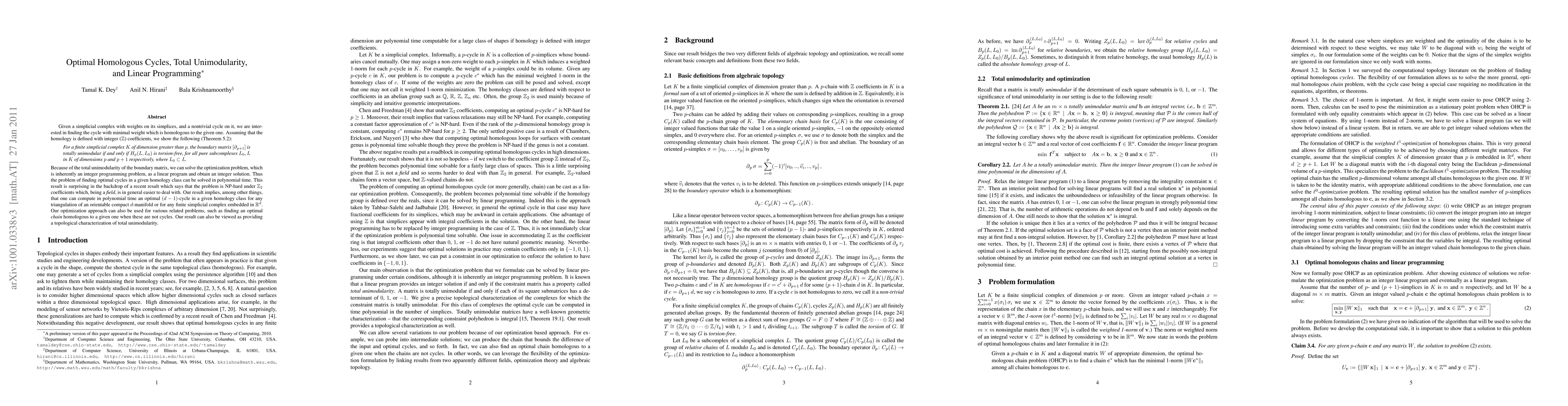This paper demonstrates that for simplicial complexes of dimension greater than $p$, the total unimodularity of the boundary matrix allows solving the optimization problem of finding minimal weight homologous cycles as a linear program, yielding an integer solution. This approach enables polynomial-time computation of optimal cycles in homology classes.