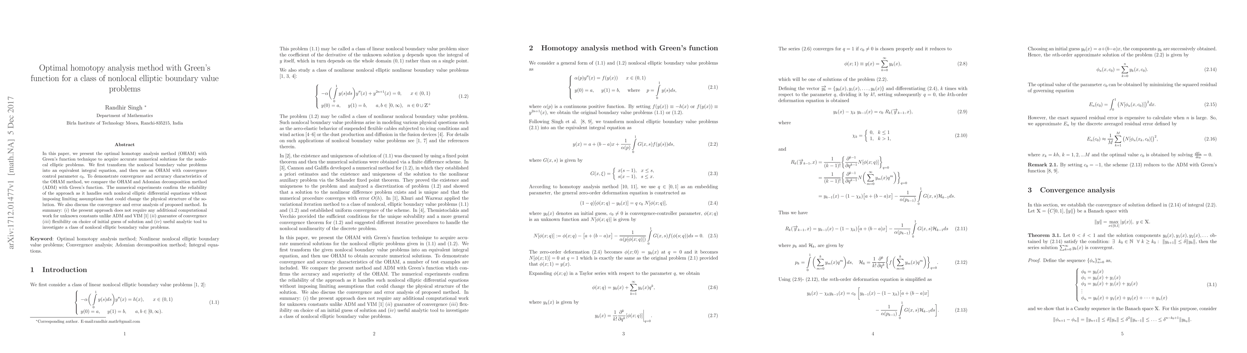 This paper introduces the optimal homotopy analysis method (OHAM) combined with Green's function to solve nonlocal elliptic boundary value problems, showing it provides accurate numerical solutions and guarantees convergence without requiring additional computational work or limiting assumptions. The method is compared to the Adomian decomposition method, demonstrating its reliability and flexibility.